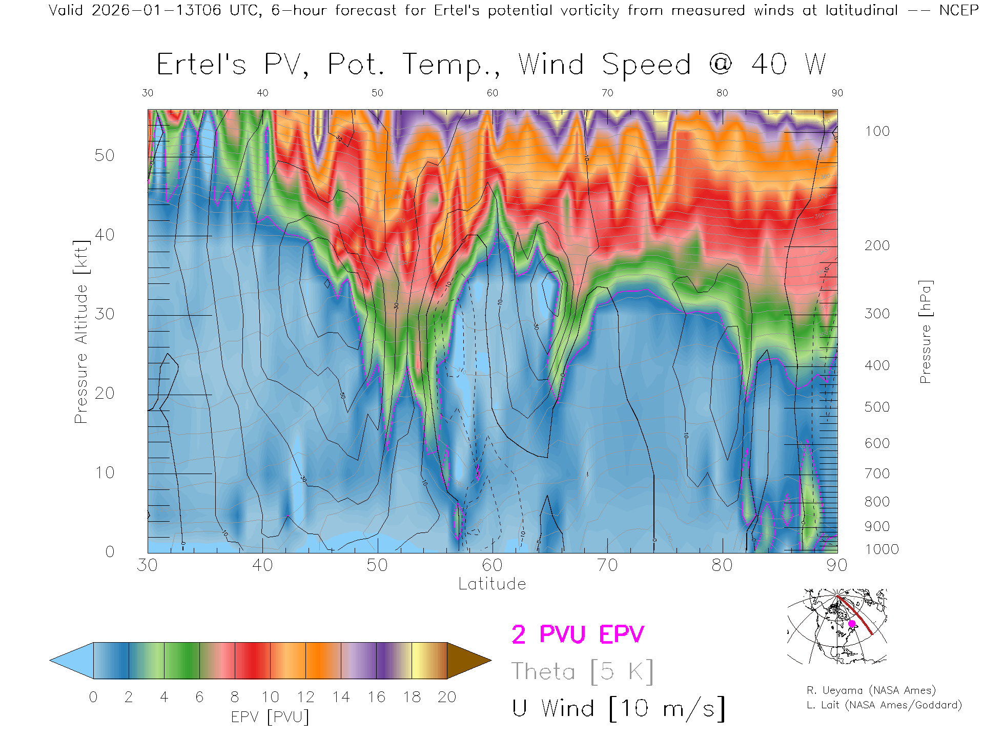 NCEP GFS Forecast PV X-Section (40 W)