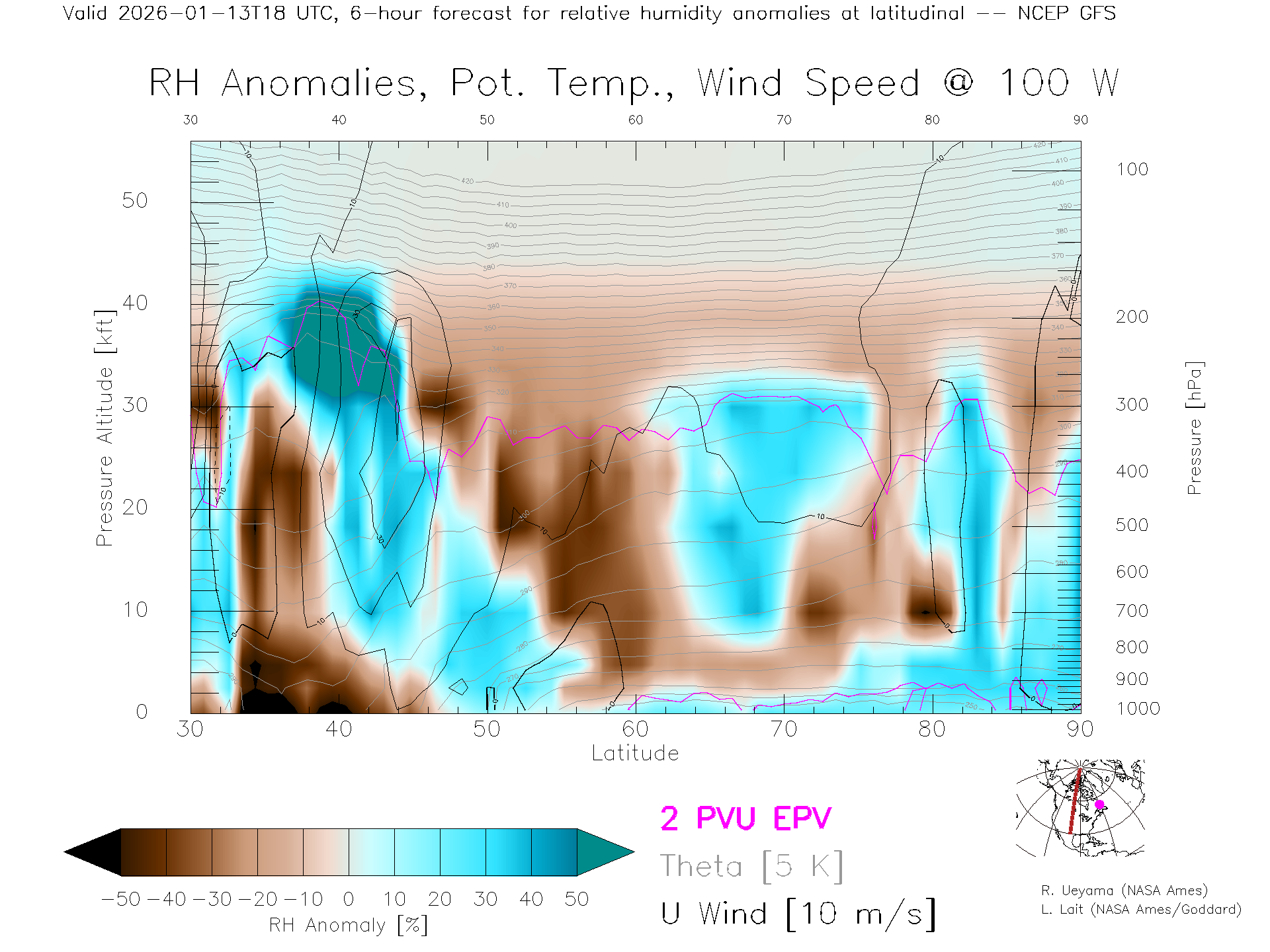 NCEP GFS Forecast Rel. Hum. X-Section (100 W)