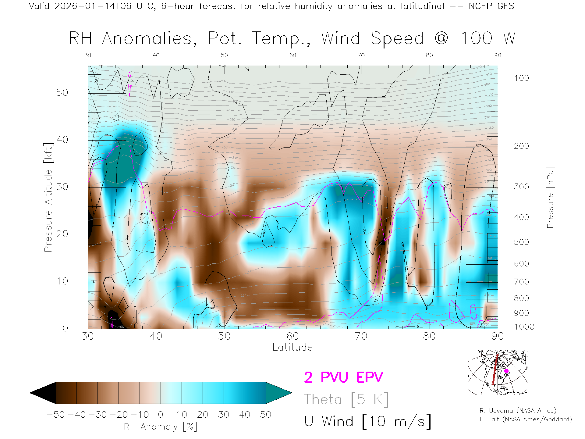 NCEP GFS Forecast Rel. Hum. X-Section (100 W)