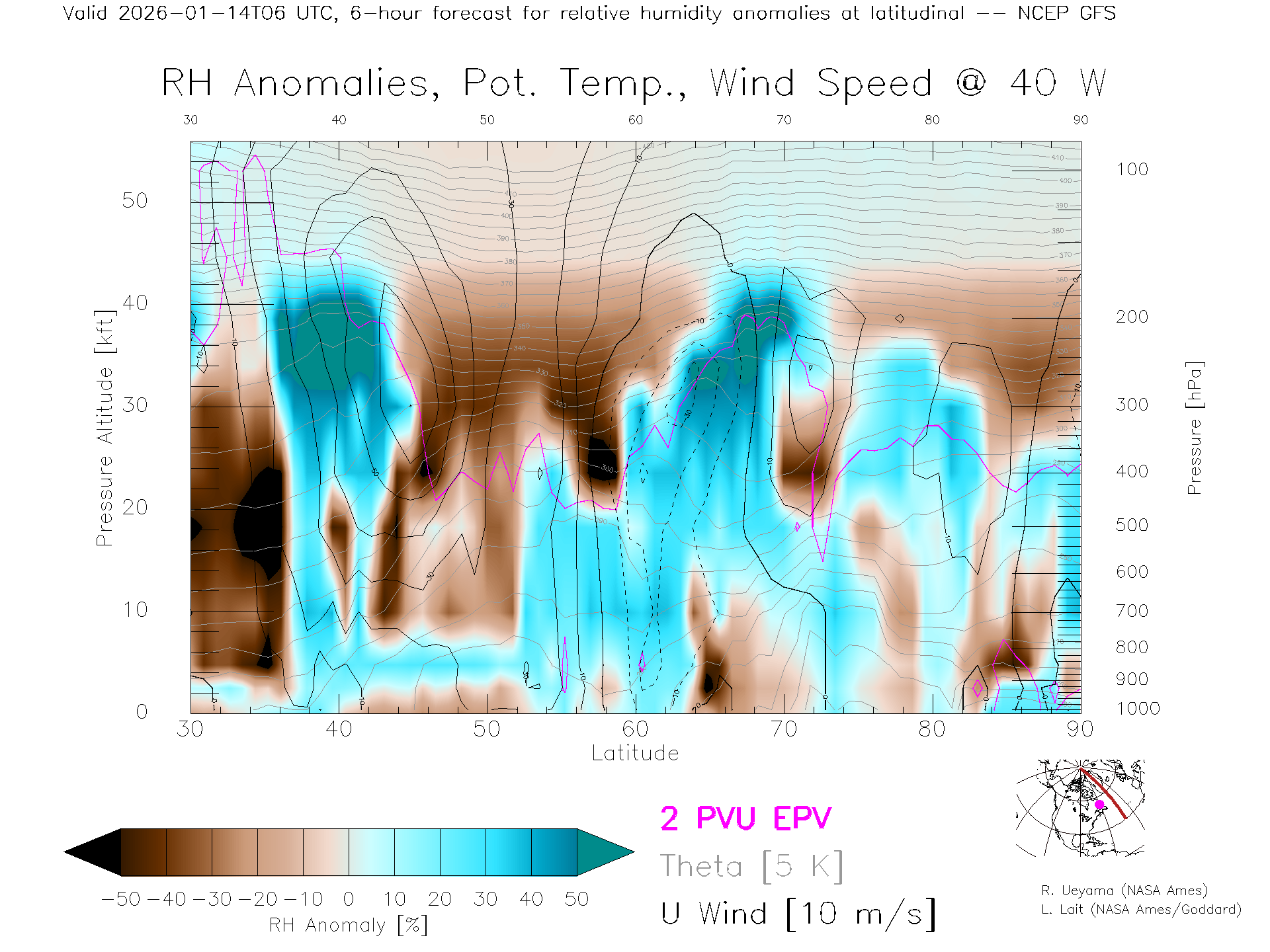 NCEP GFS Forecast Rel. Hum. X-Section (40 W)