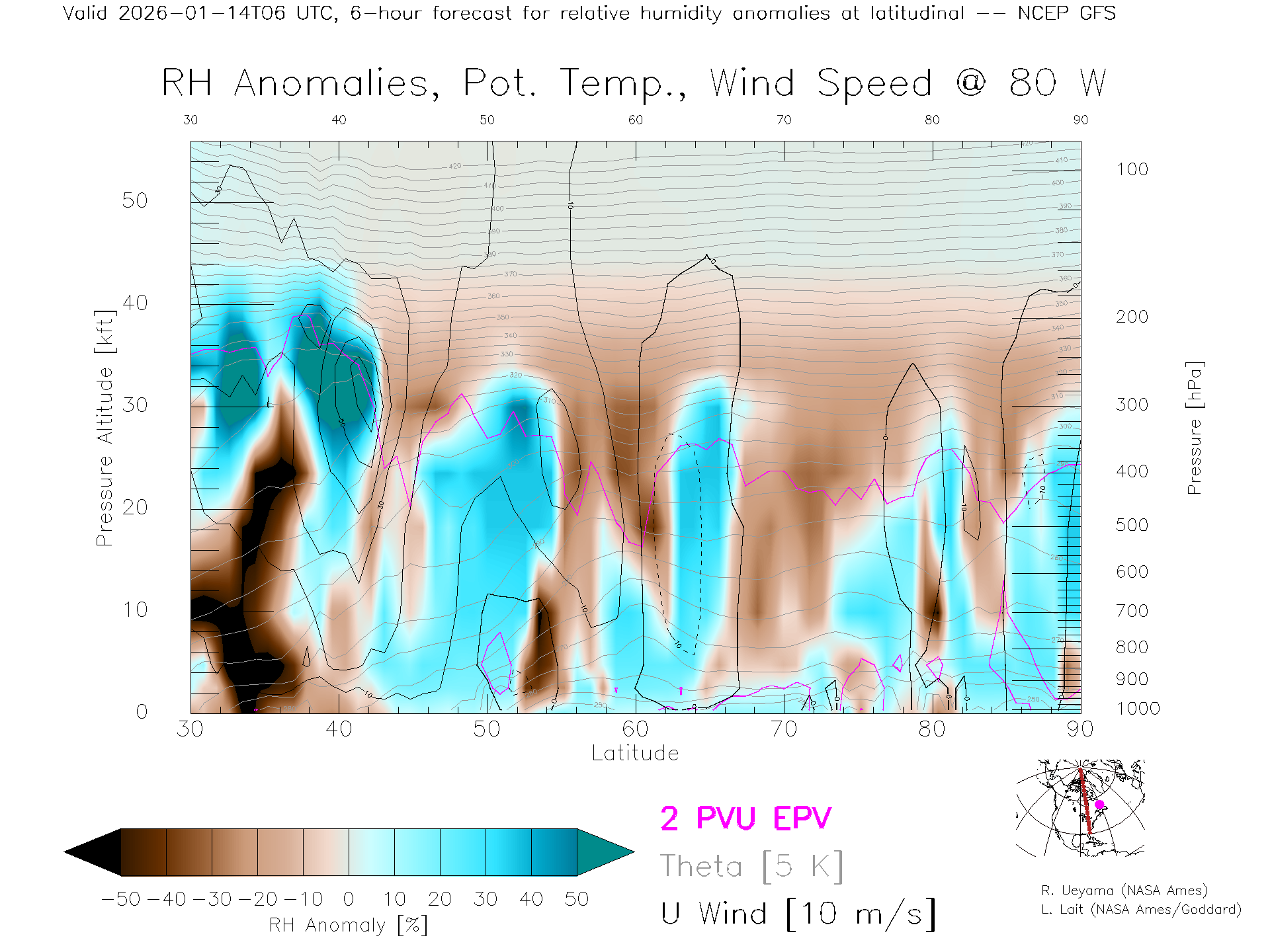 NCEP GFS Forecast Rel. Hum. X-Section (80 W)