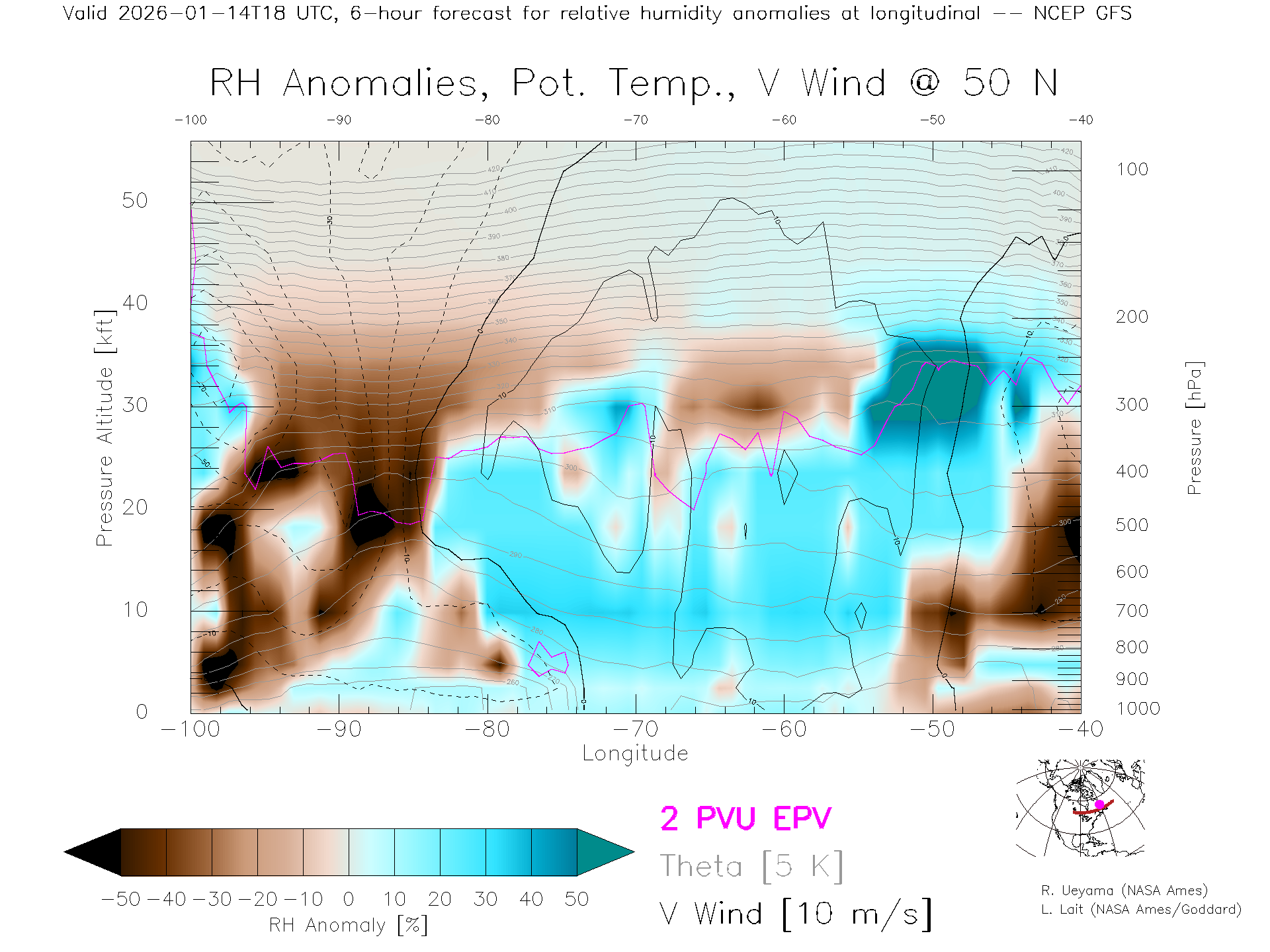 NCEP GFS Forecast Rel. Hum. X-Section (50 N)