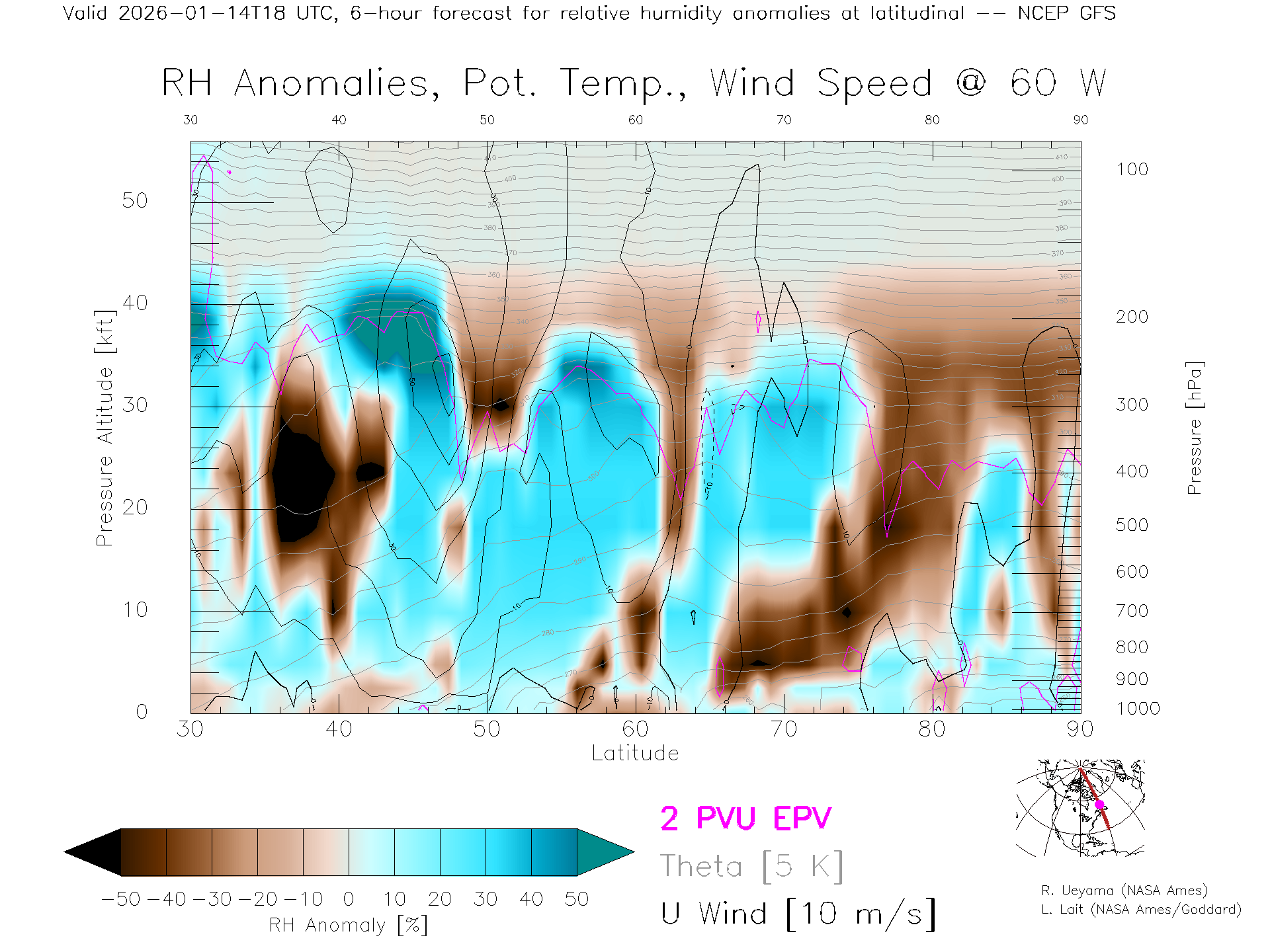 NCEP GFS Forecast Rel. Hum. X-Section (60 W)