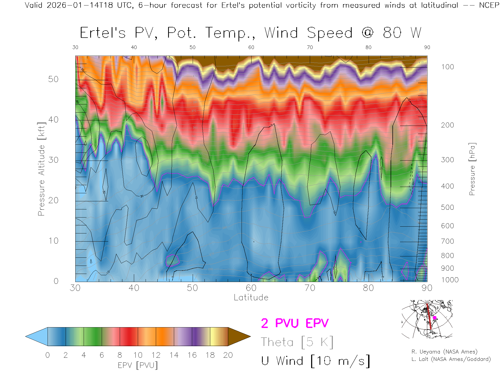 NCEP GFS Forecast PV X-Section (80 W)