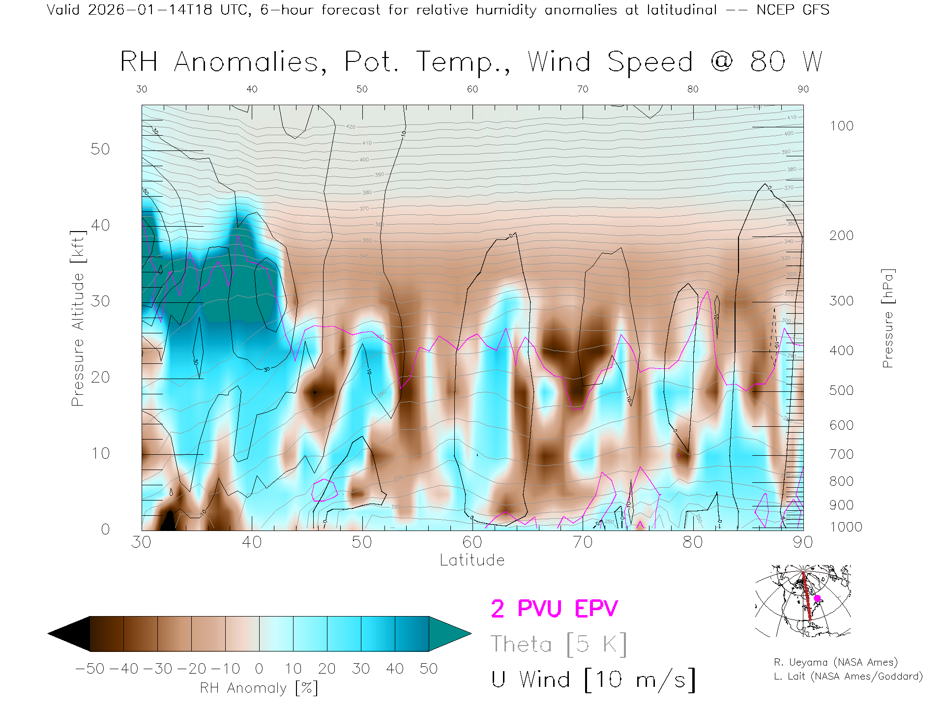 NCEP GFS Forecast Rel. Hum. X-Section (80 W)