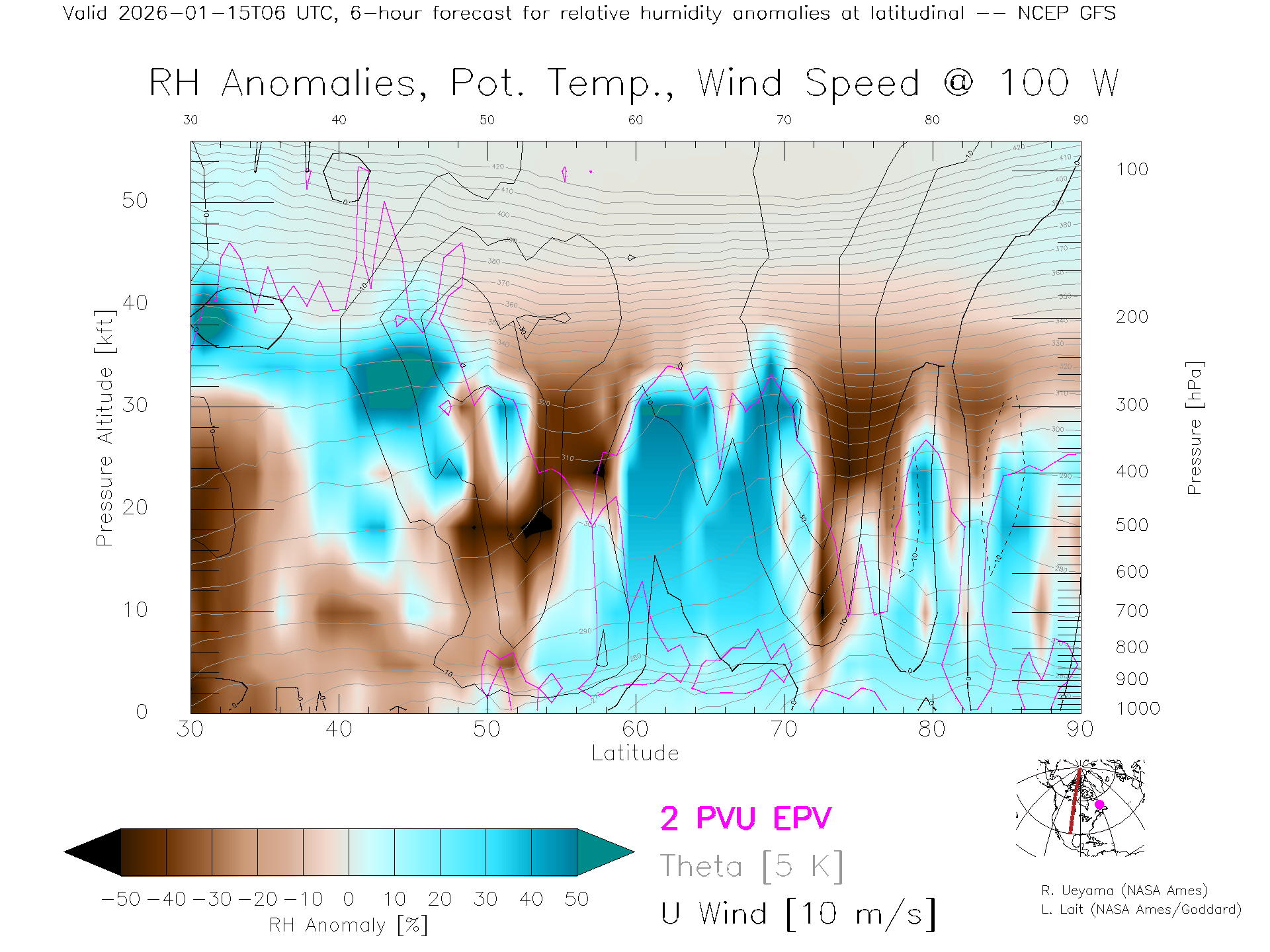 NCEP GFS Forecast Rel. Hum. X-Section (100 W)