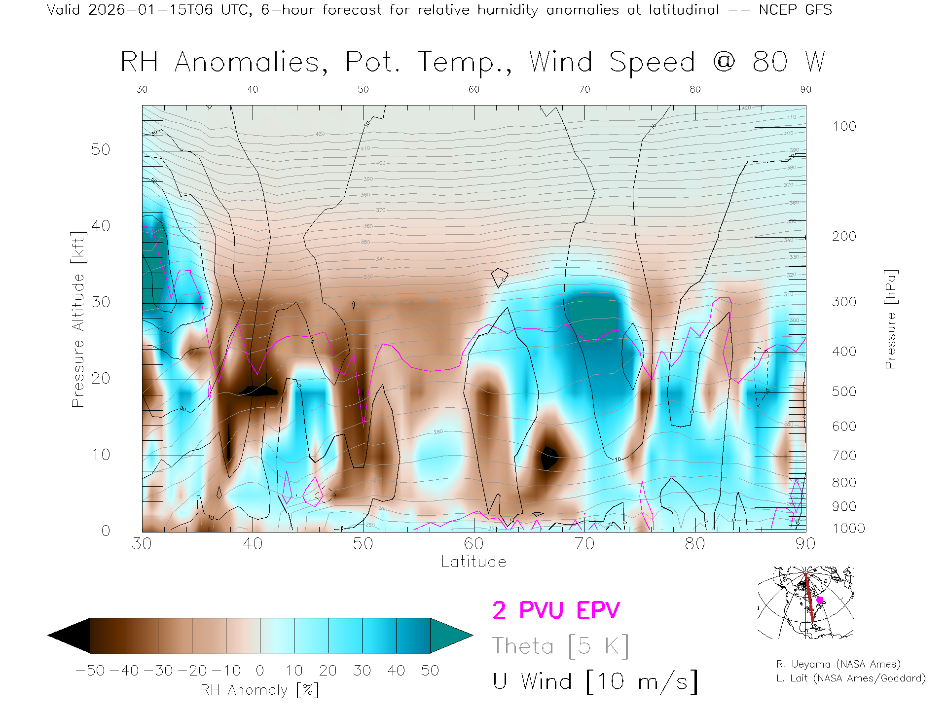NCEP GFS Forecast Rel. Hum. X-Section (80 W)