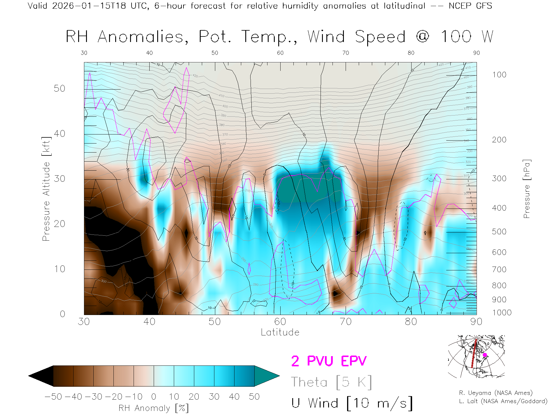 NCEP GFS Forecast Rel. Hum. X-Section (100 W)