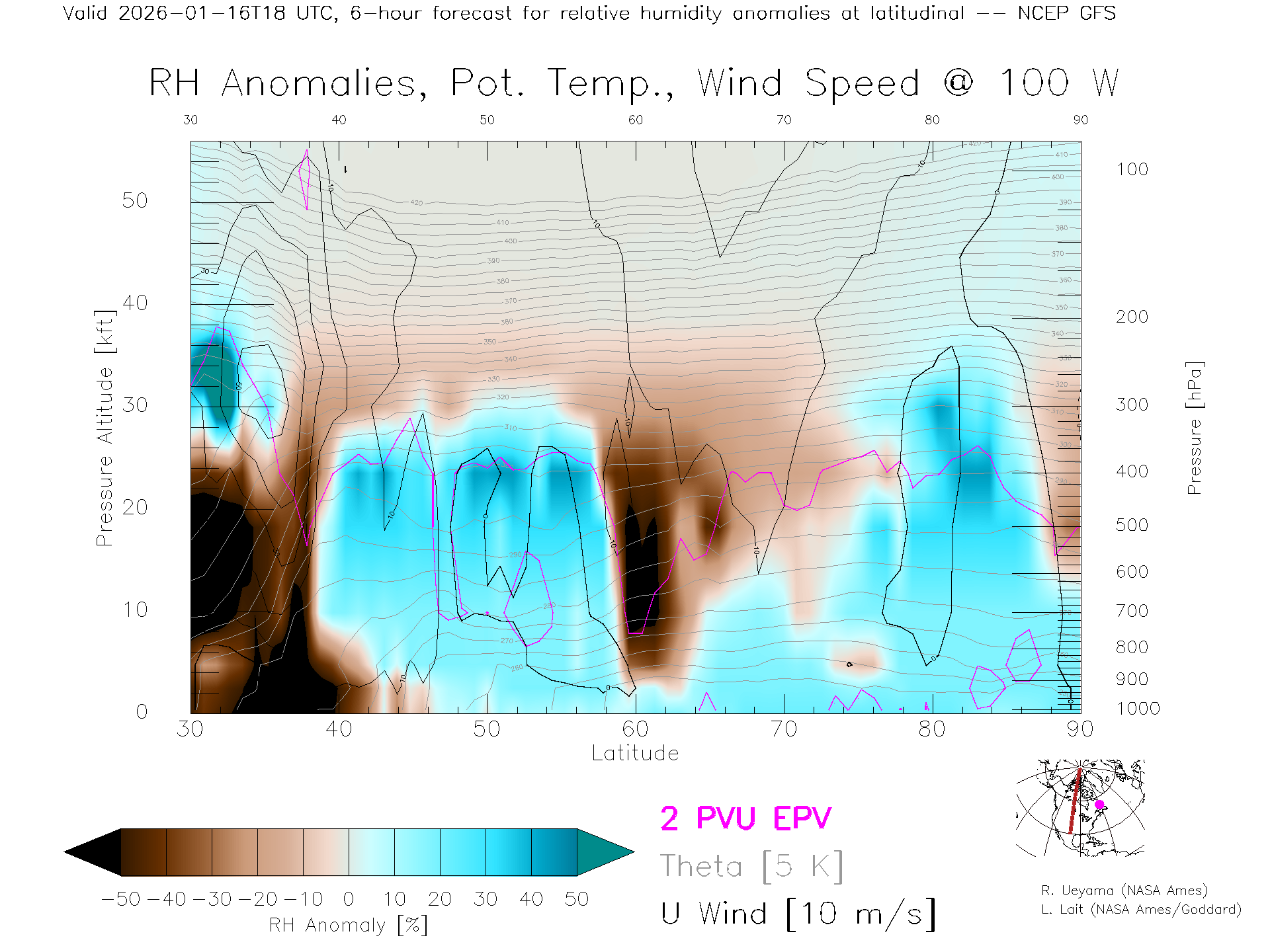 NCEP GFS Forecast Rel. Hum. X-Section (100 W)