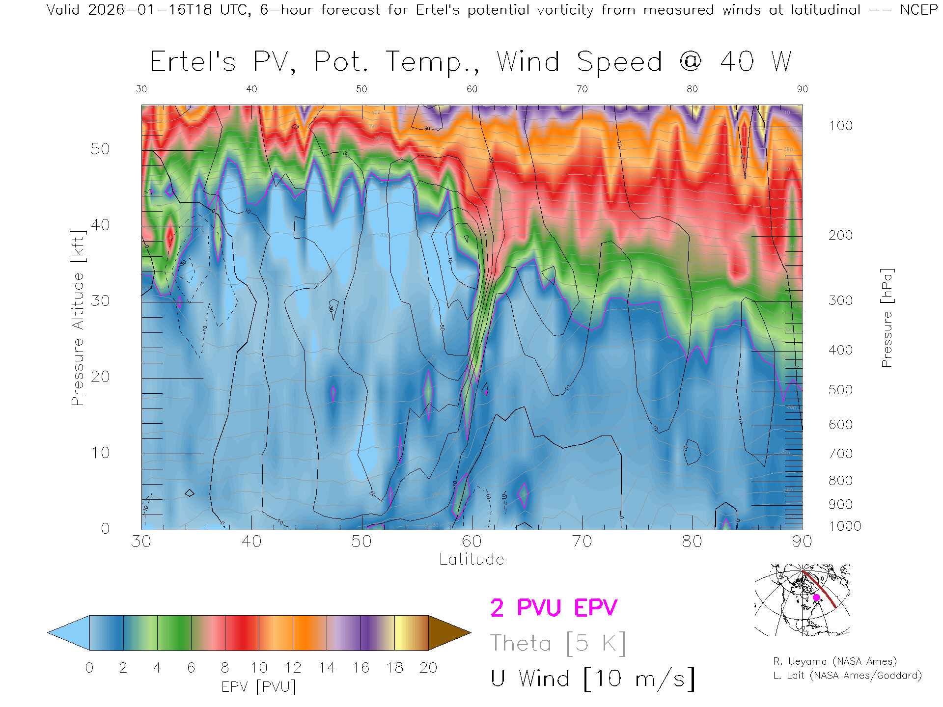 NCEP GFS Forecast PV X-Section (40 W)