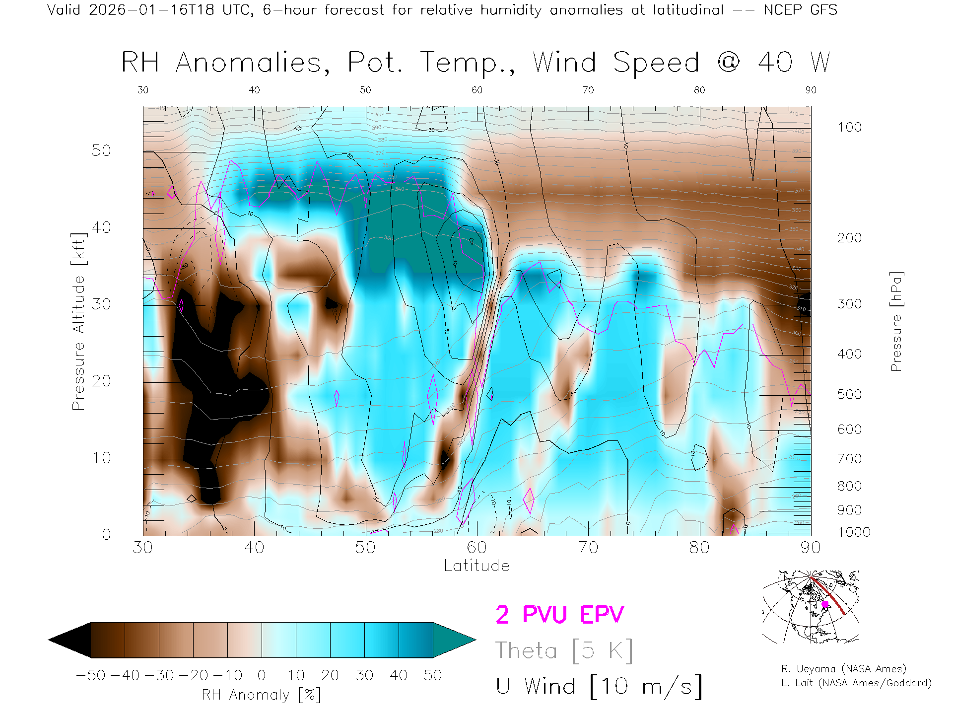 NCEP GFS Forecast Rel. Hum. X-Section (40 W)