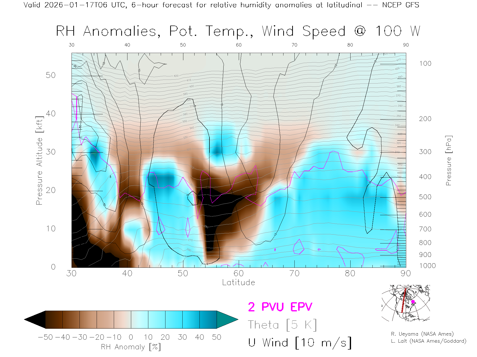 NCEP GFS Forecast Rel. Hum. X-Section (100 W)