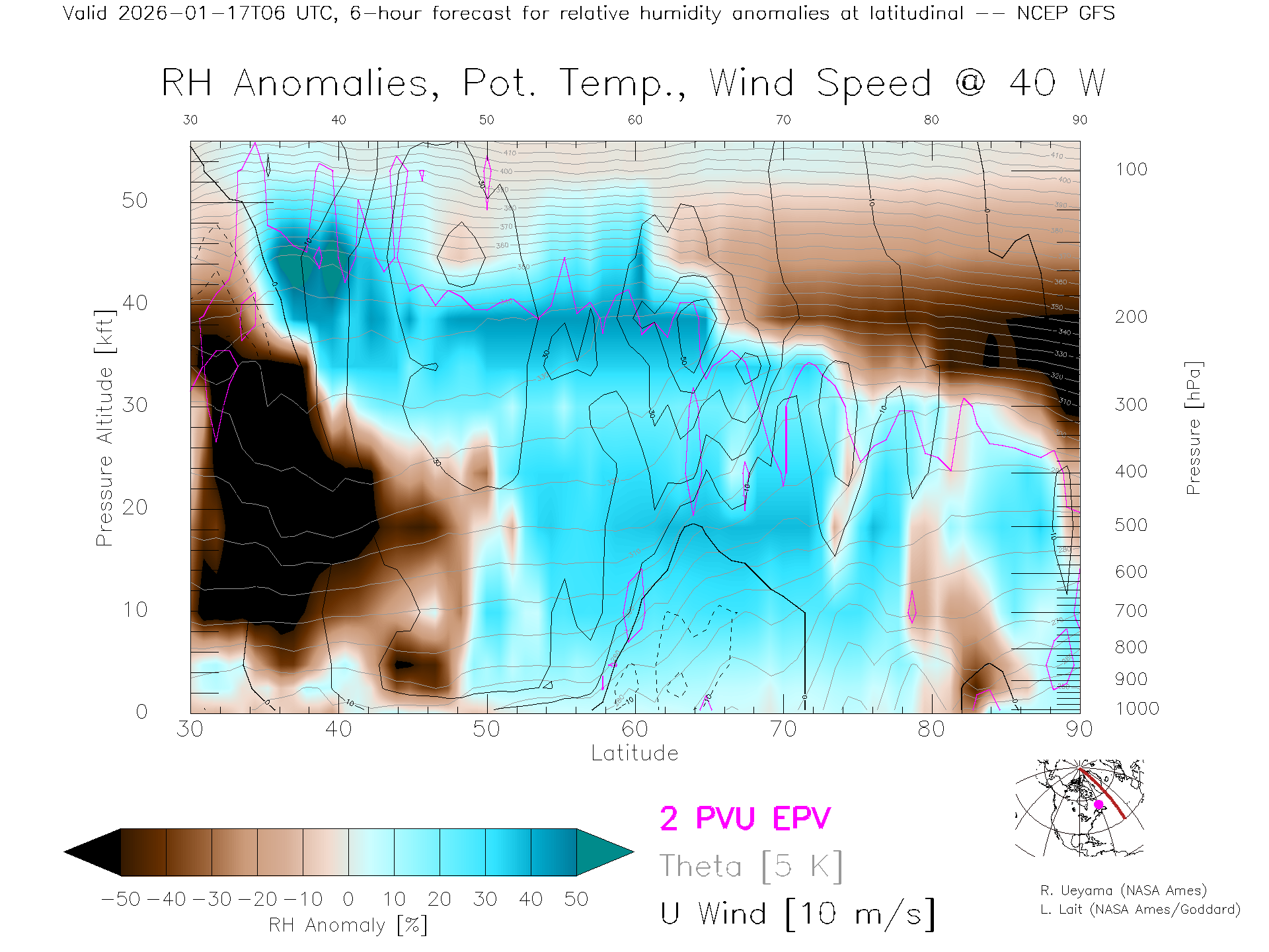 NCEP GFS Forecast Rel. Hum. X-Section (40 W)
