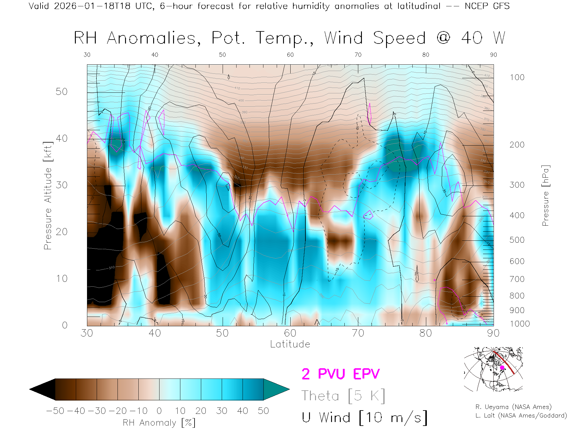 NCEP GFS Forecast Rel. Hum. X-Section (40 W)