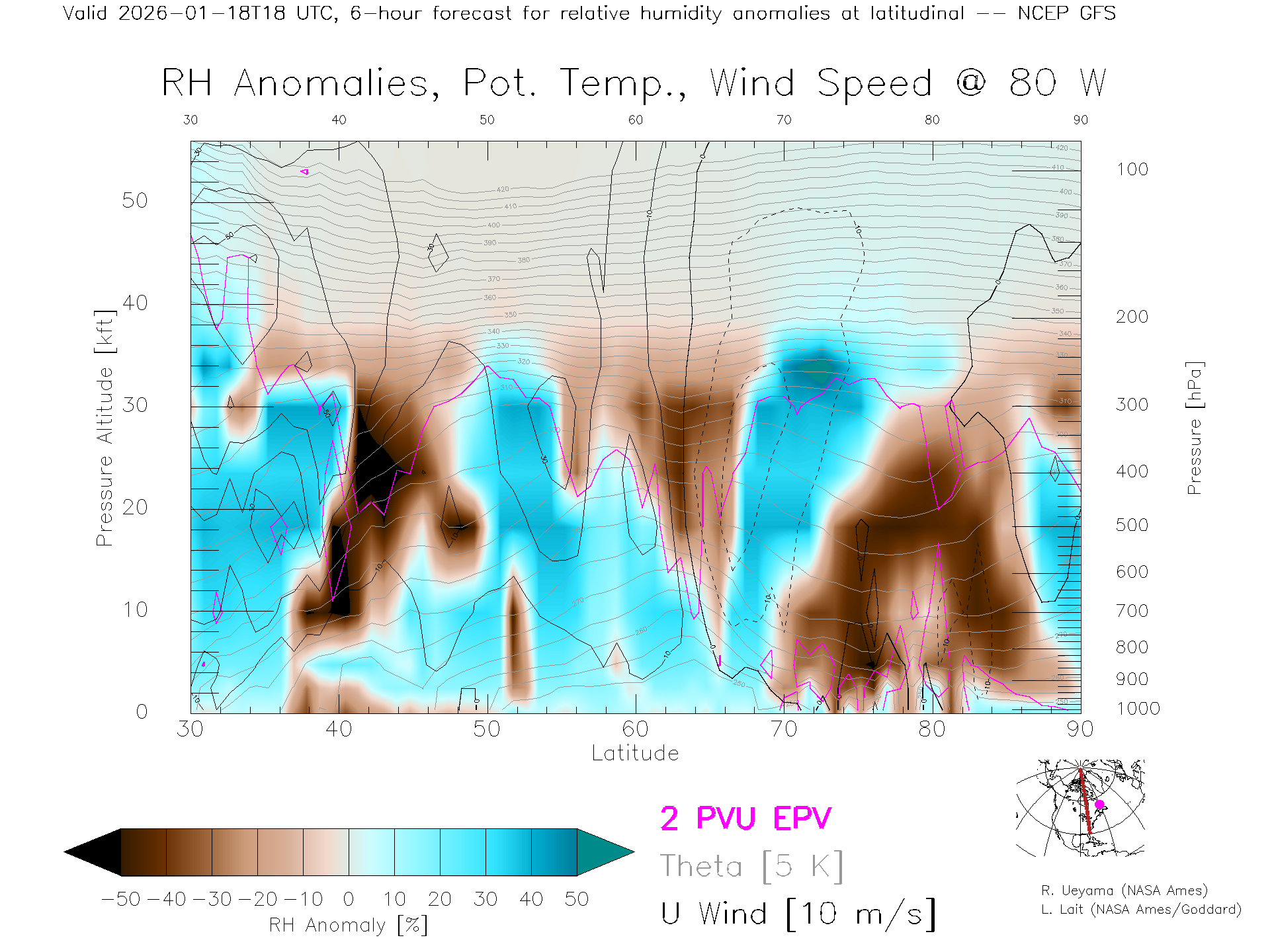 NCEP GFS Forecast Rel. Hum. X-Section (80 W)
