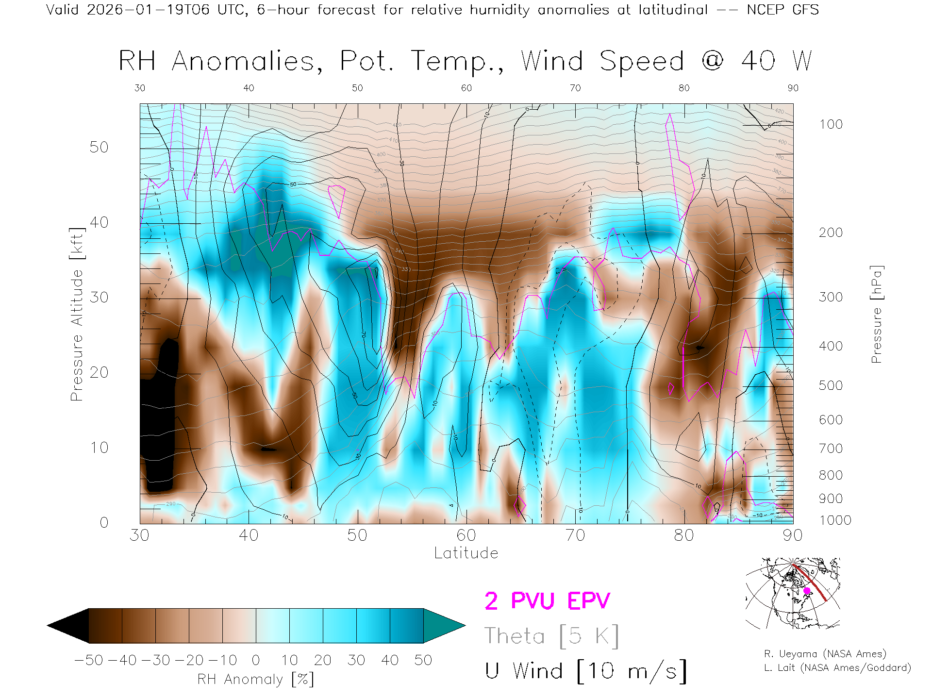 NCEP GFS Forecast Rel. Hum. X-Section (40 W)
