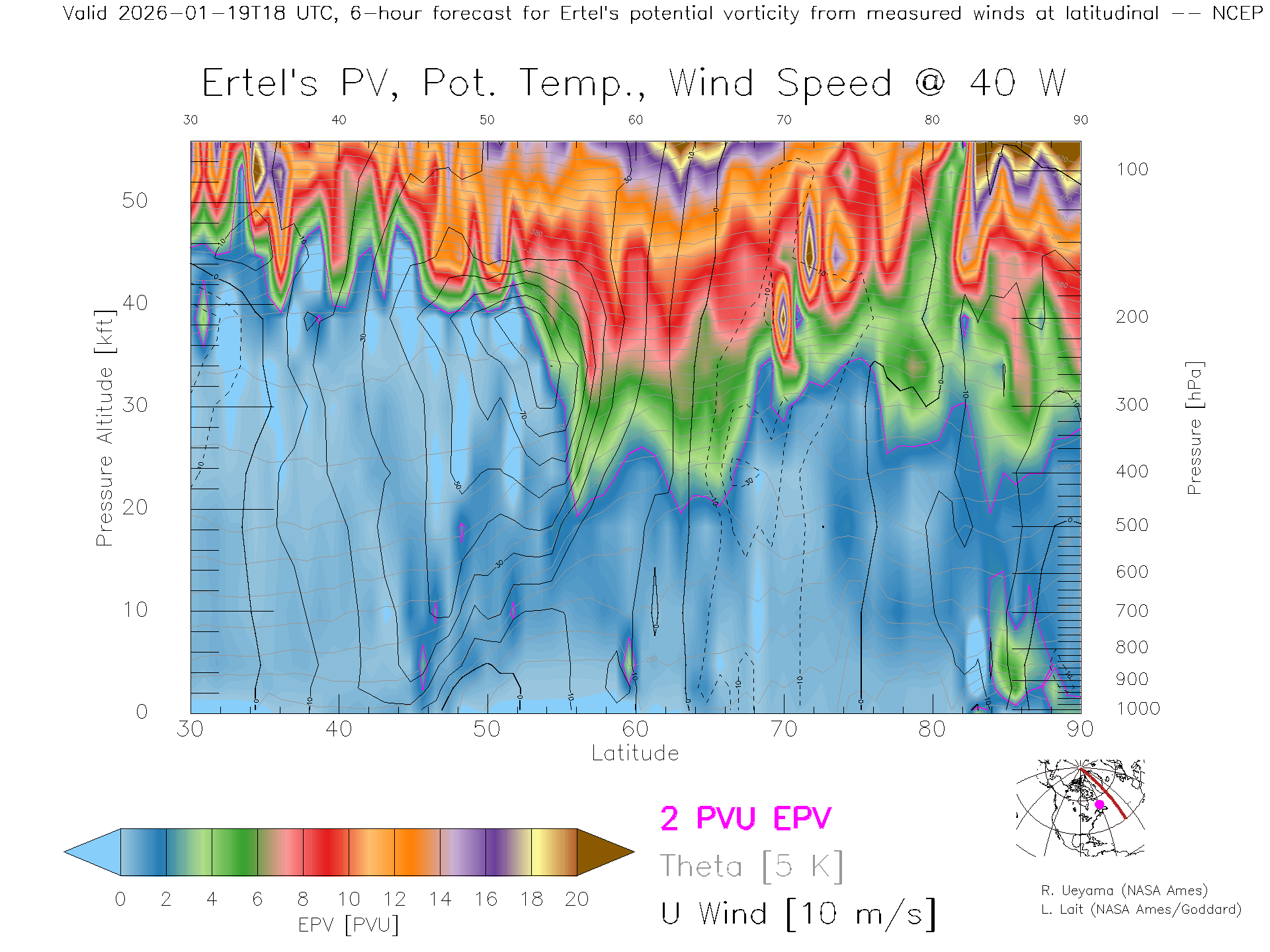 NCEP GFS Forecast PV X-Section (40 W)