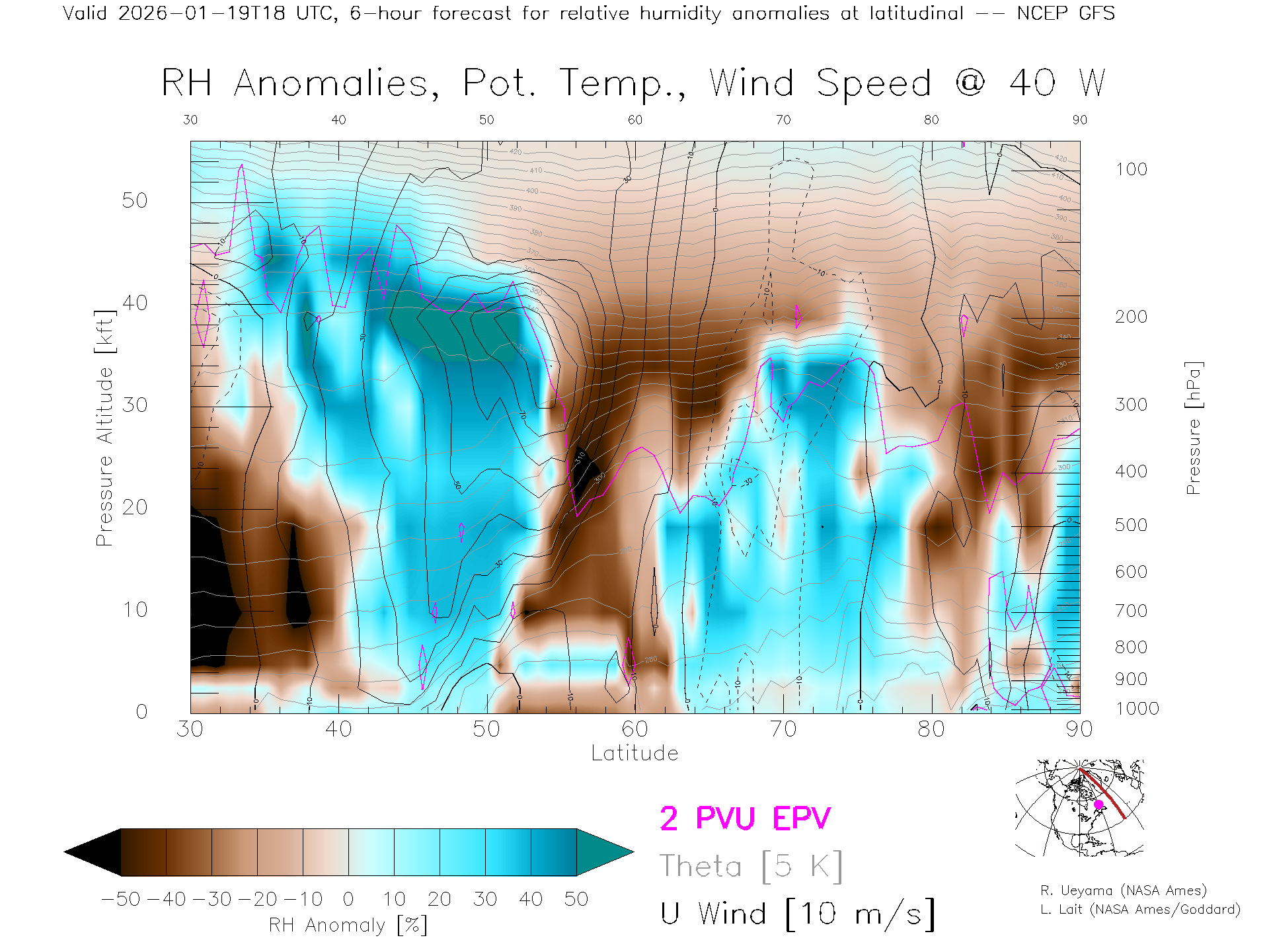 NCEP GFS Forecast Rel. Hum. X-Section (40 W)
