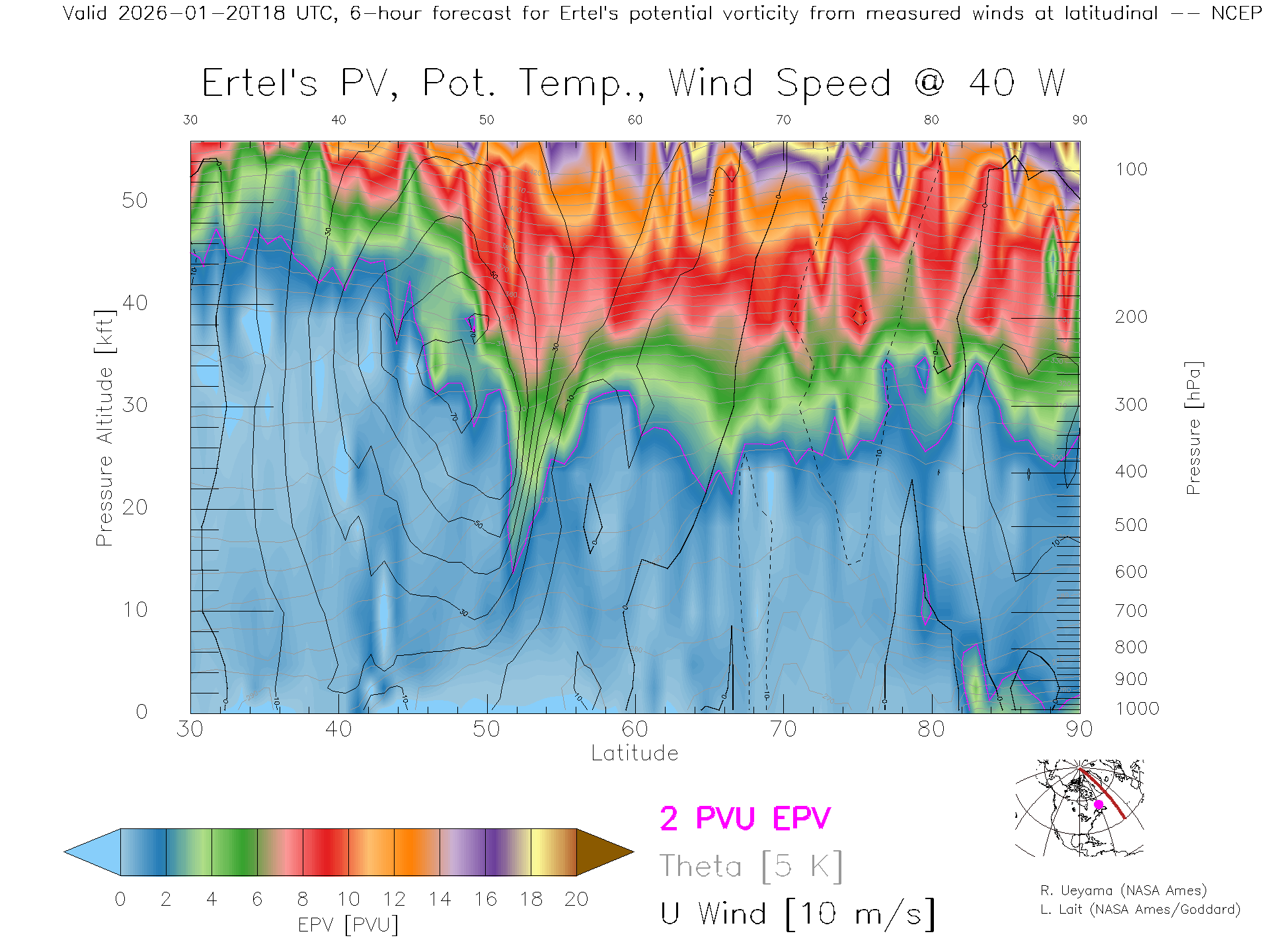 NCEP GFS Forecast PV X-Section (40 W)