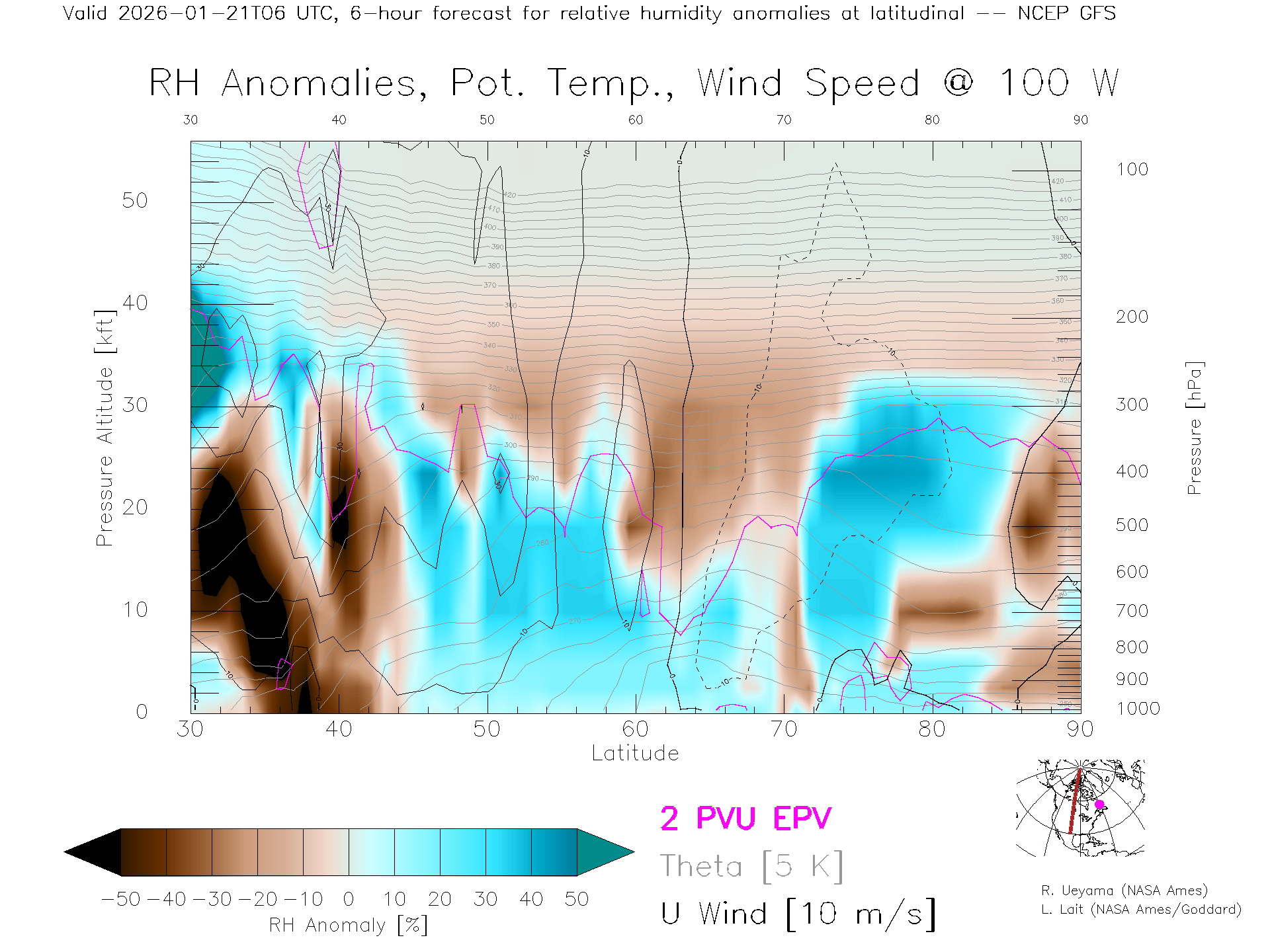 NCEP GFS Forecast Rel. Hum. X-Section (100 W)