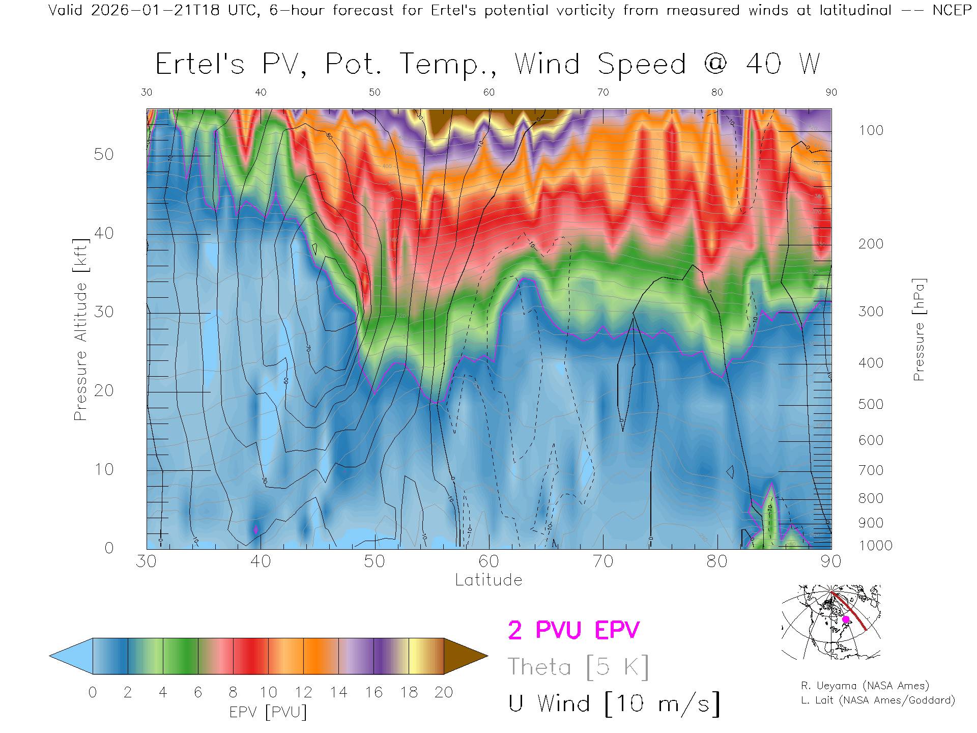 NCEP GFS Forecast PV X-Section (40 W)