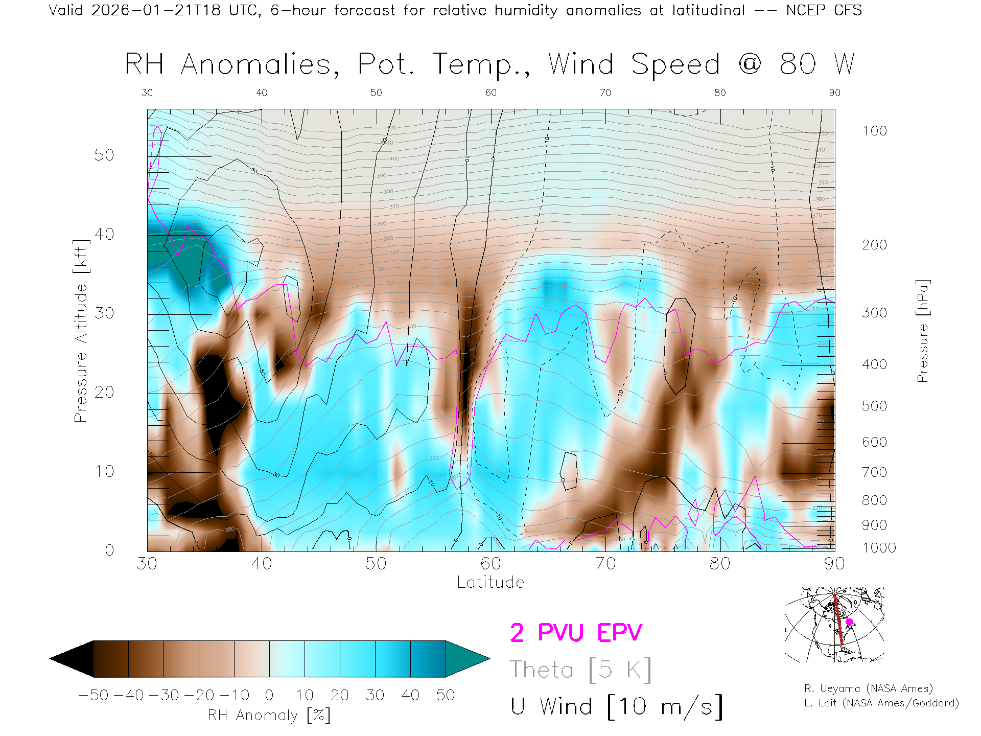 NCEP GFS Forecast Rel. Hum. X-Section (80 W)