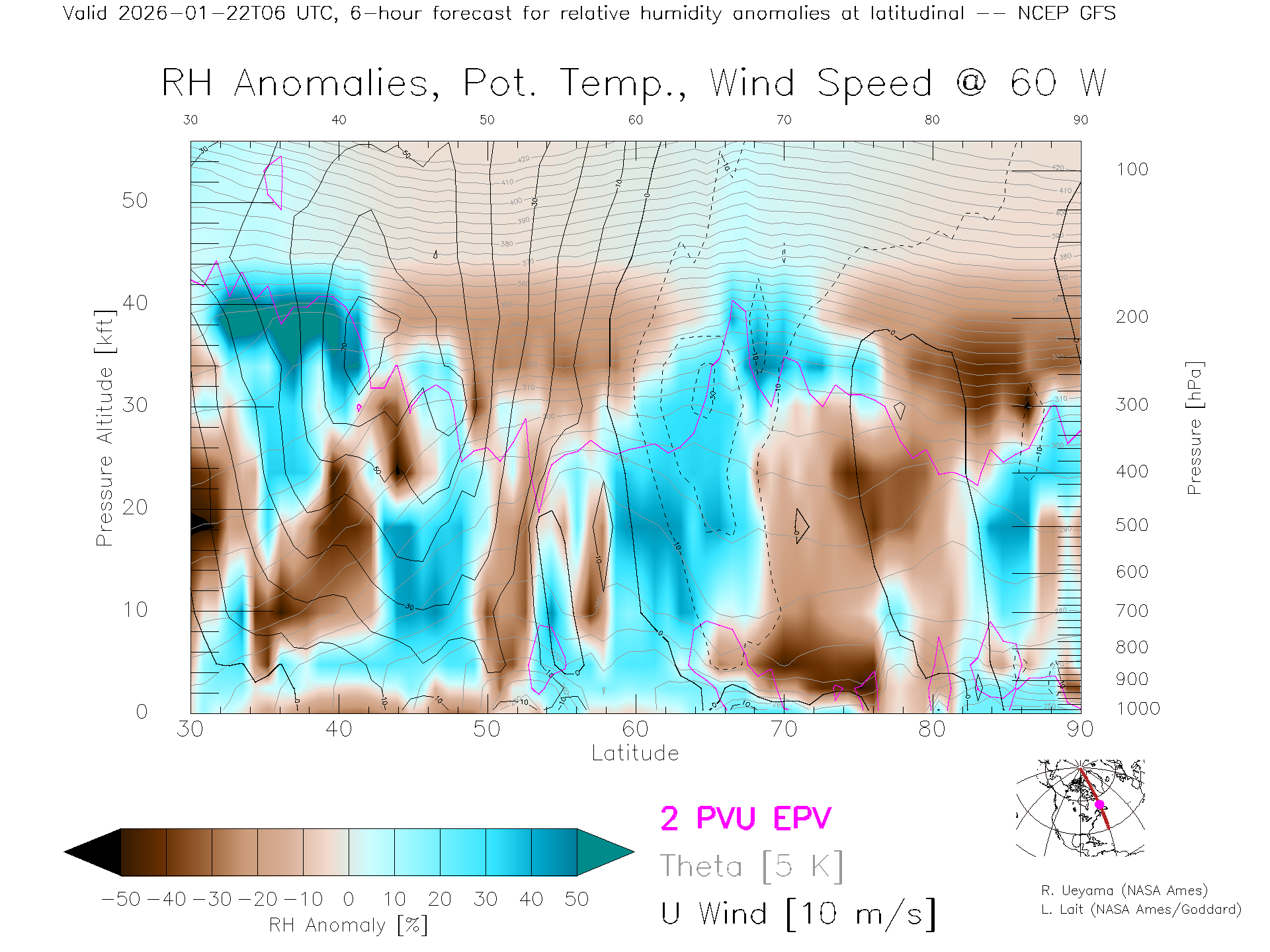 NCEP GFS Forecast Rel. Hum. X-Section (60 W)