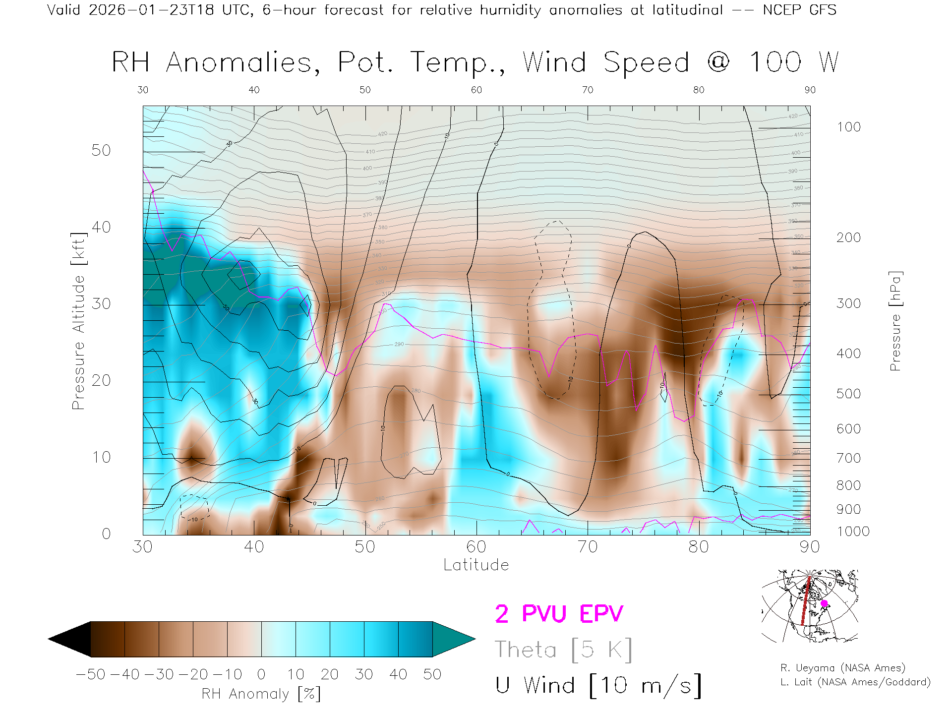NCEP GFS Forecast Rel. Hum. X-Section (100 W)