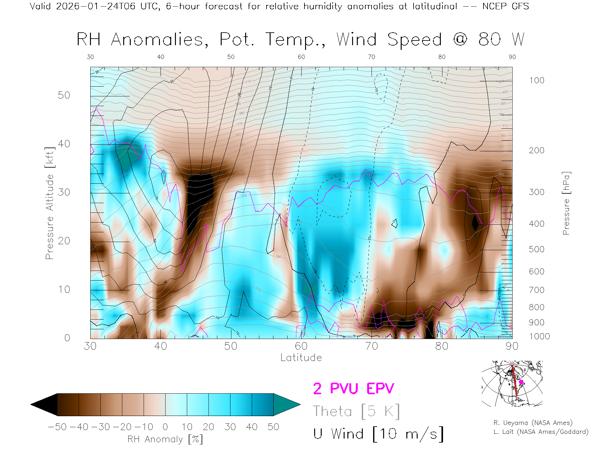 NCEP GFS Forecast Rel. Hum. X-Section (80 W)