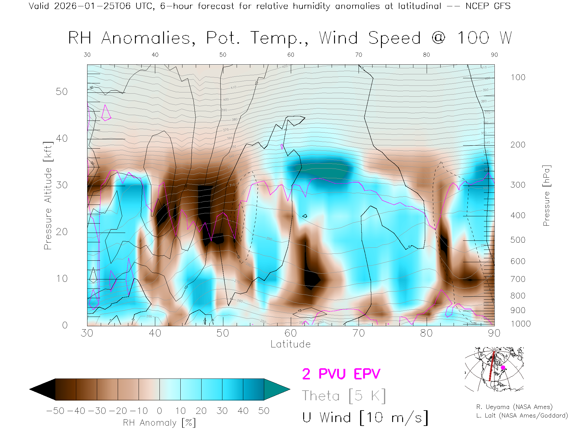 NCEP GFS Forecast Rel. Hum. X-Section (100 W)