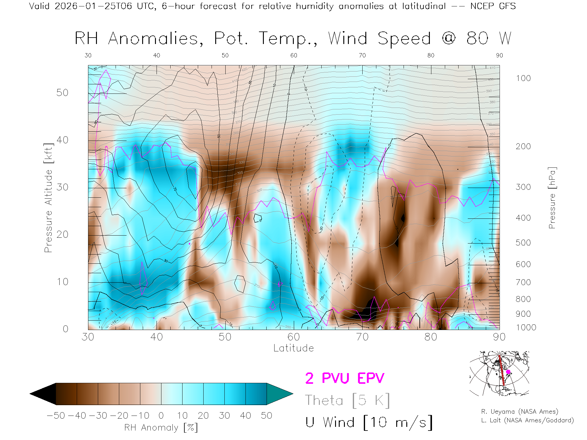 NCEP GFS Forecast Rel. Hum. X-Section (80 W)