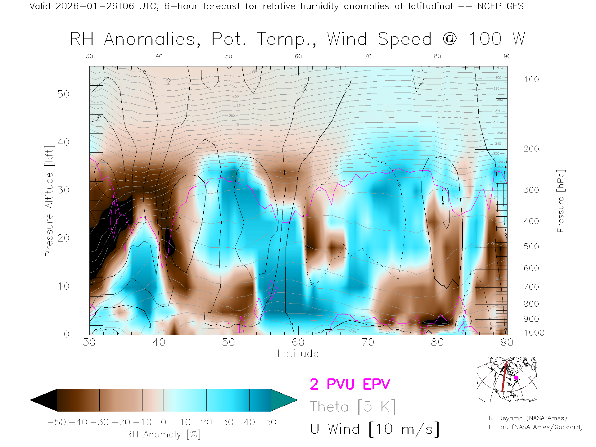 NCEP GFS Forecast Rel. Hum. X-Section (100 W)