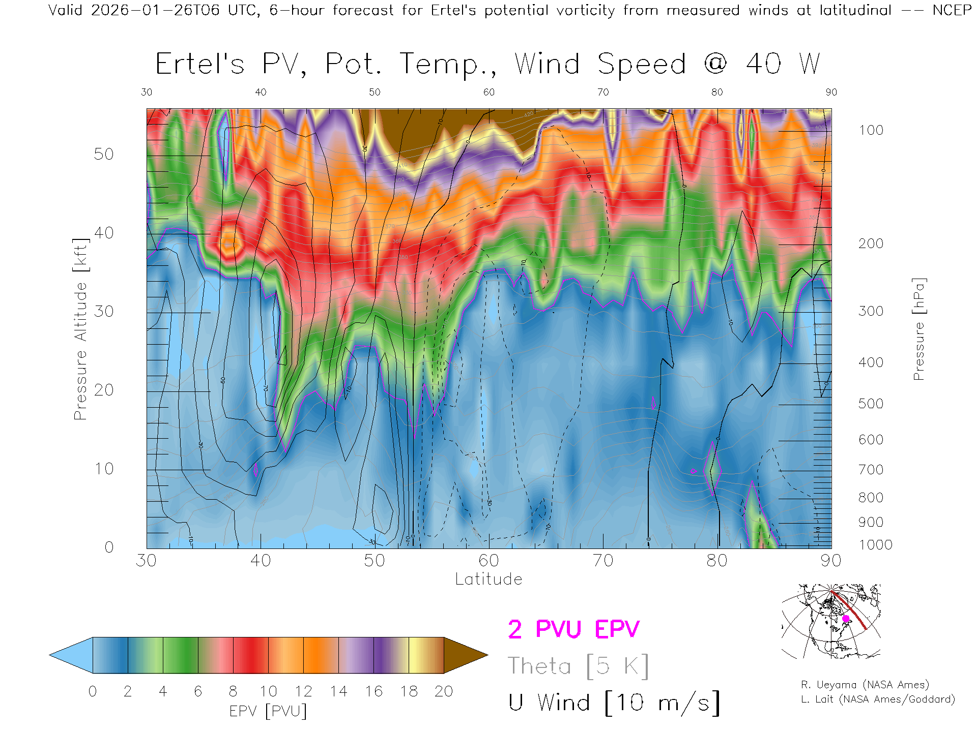 NCEP GFS Forecast PV X-Section (40 W)