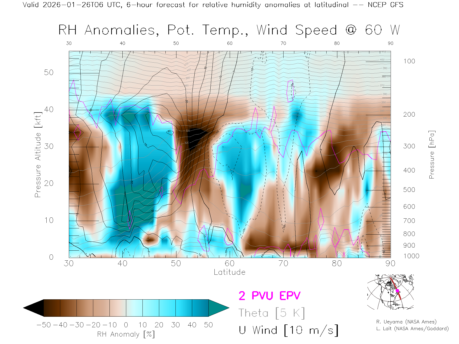 NCEP GFS Forecast Rel. Hum. X-Section (60 W)