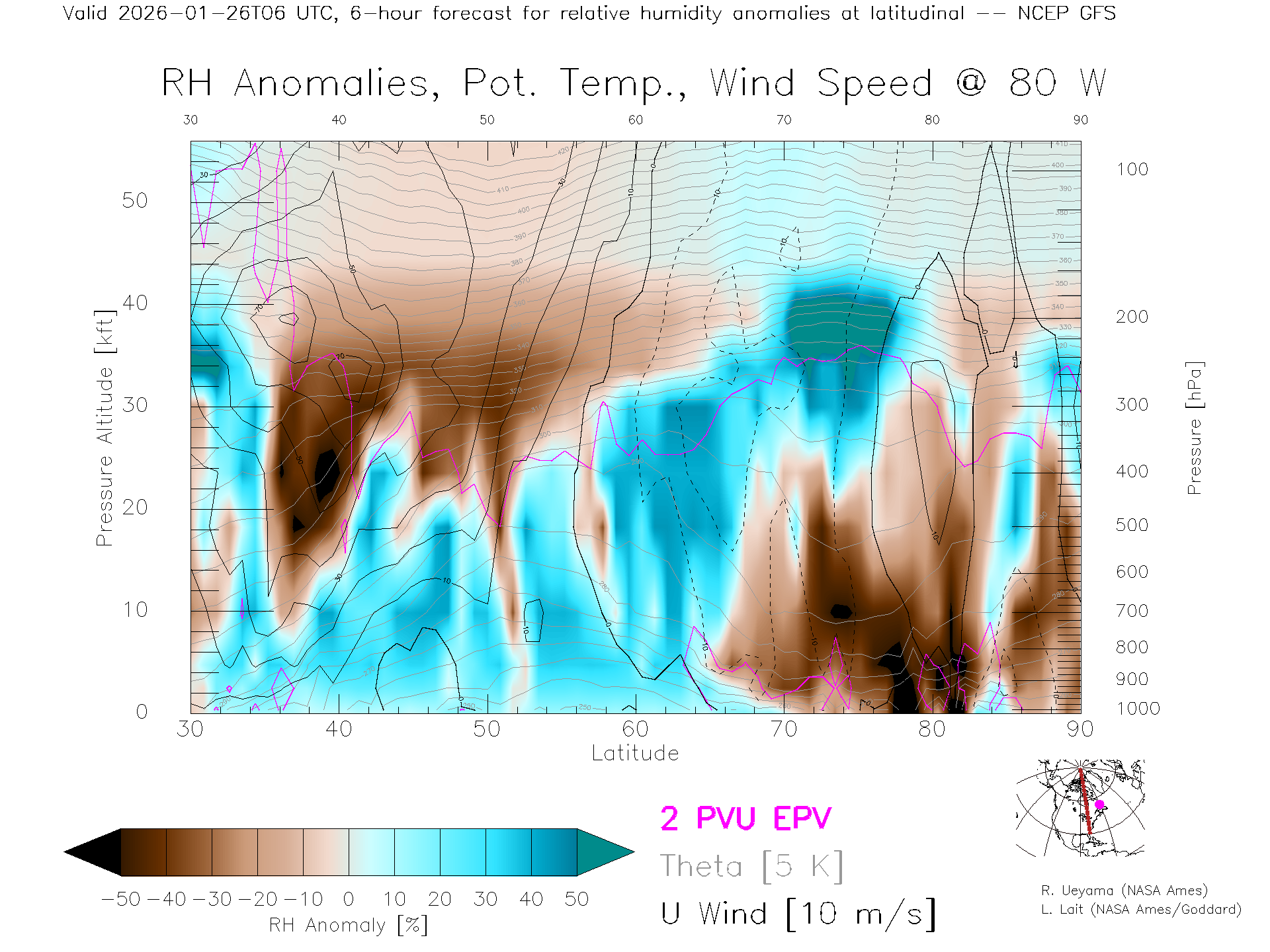 NCEP GFS Forecast Rel. Hum. X-Section (80 W)