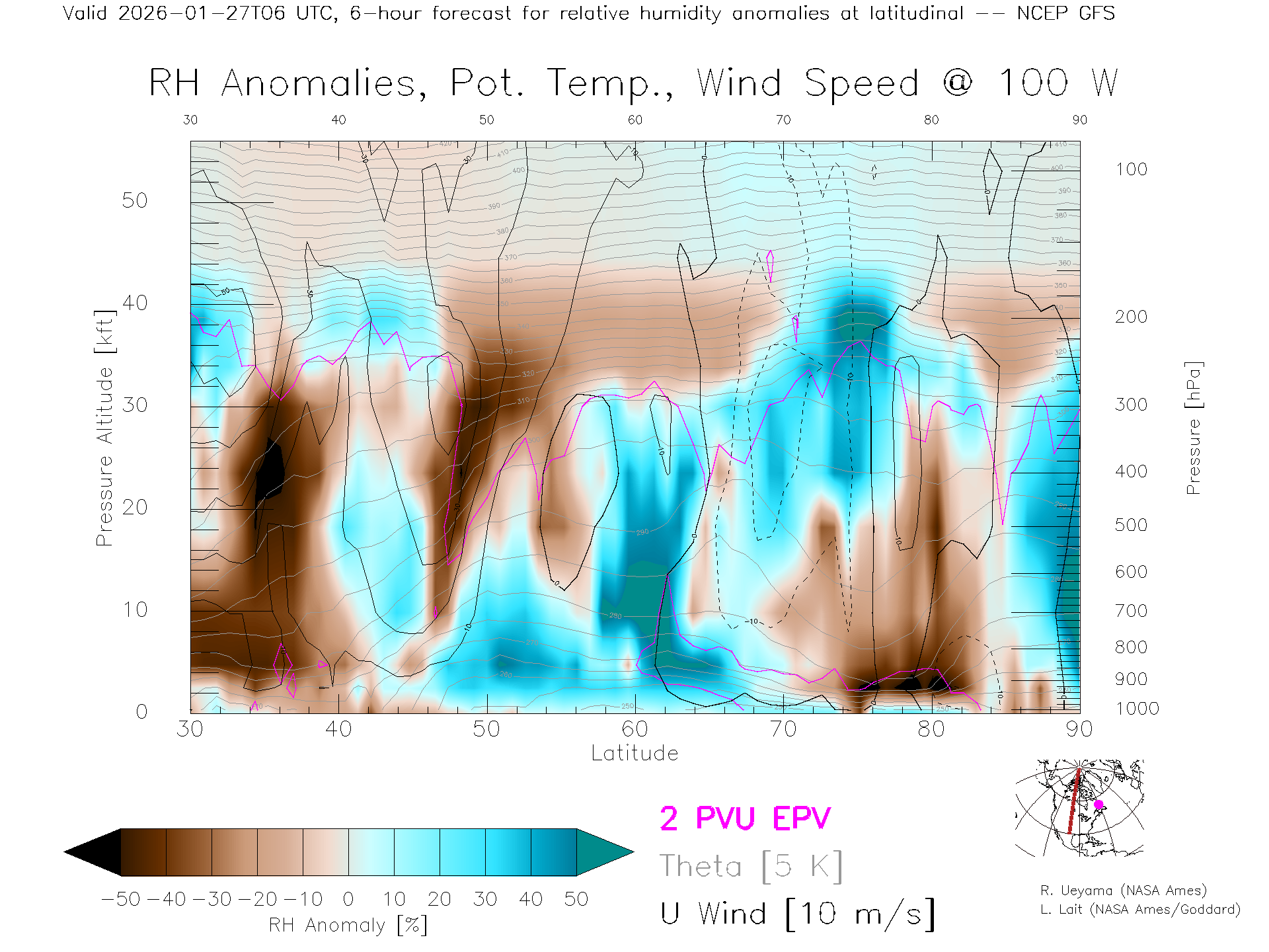 NCEP GFS Forecast Rel. Hum. X-Section (100 W)