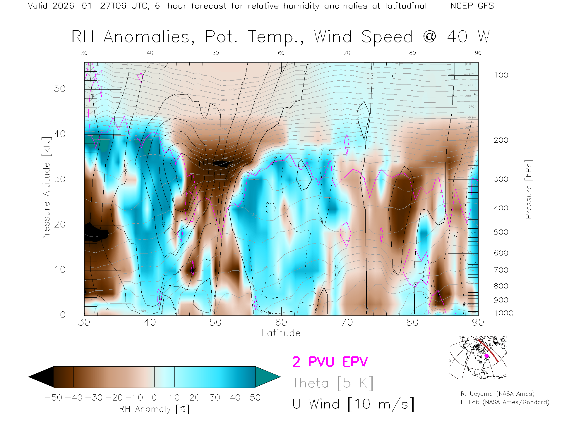 NCEP GFS Forecast Rel. Hum. X-Section (40 W)