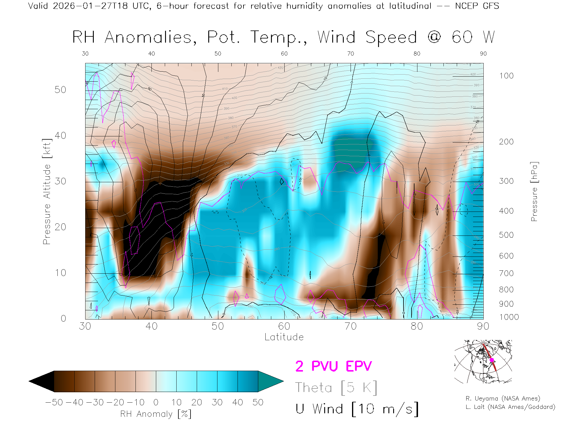 NCEP GFS Forecast Rel. Hum. X-Section (60 W)