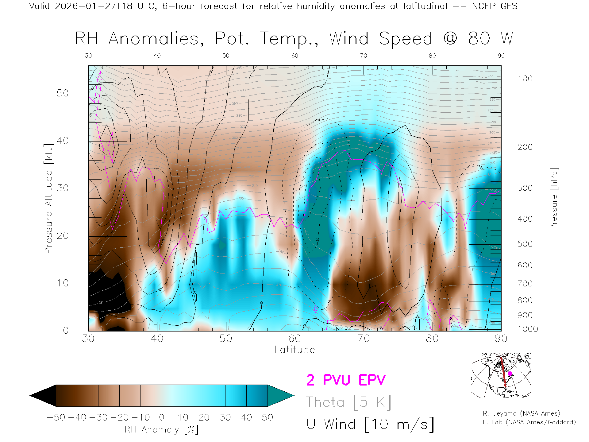 NCEP GFS Forecast Rel. Hum. X-Section (80 W)