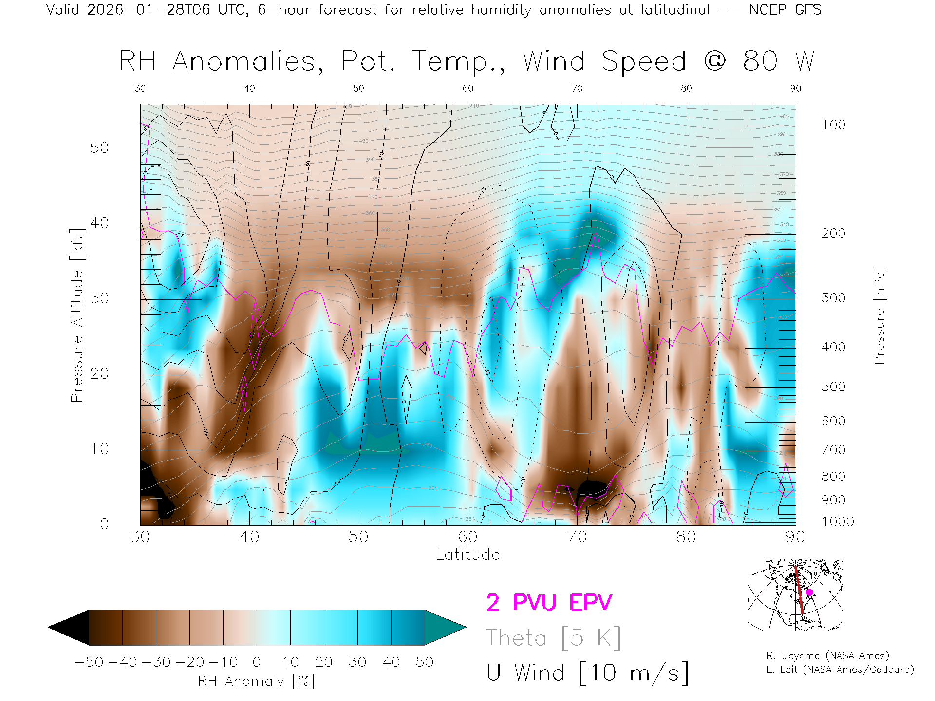 NCEP GFS Forecast Rel. Hum. X-Section (80 W)
