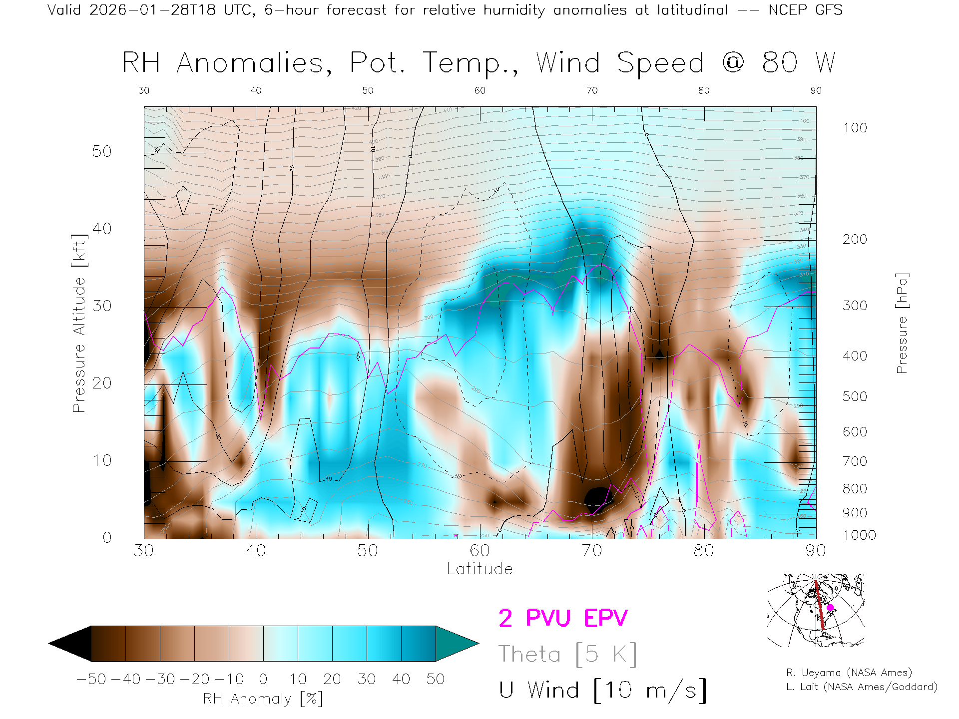 NCEP GFS Forecast Rel. Hum. X-Section (80 W)