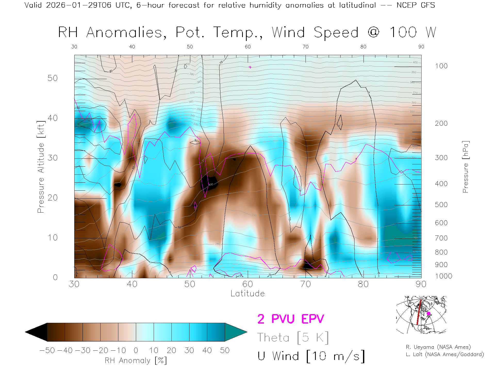 NCEP GFS Forecast Rel. Hum. X-Section (100 W)