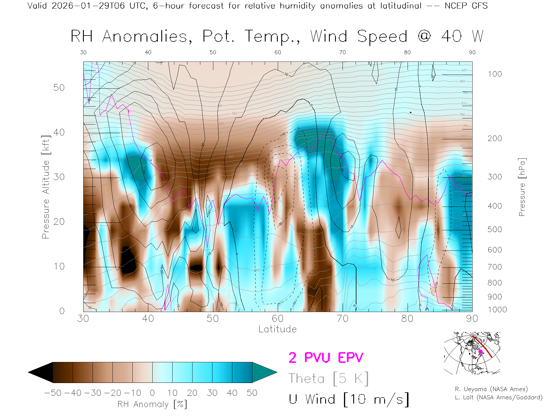 NCEP GFS Forecast Rel. Hum. X-Section (40 W)