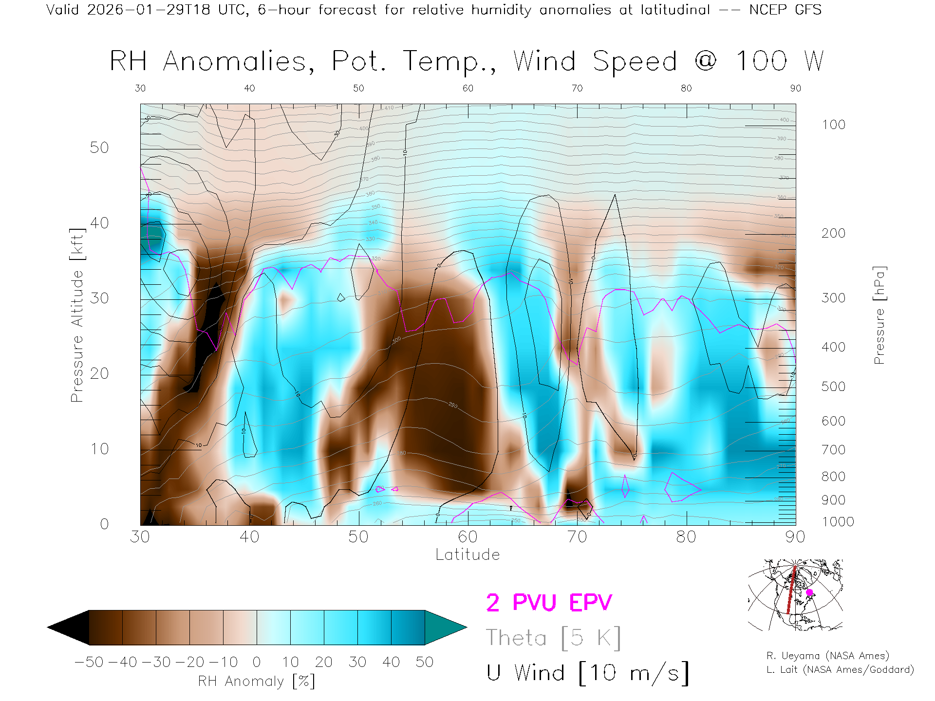 NCEP GFS Forecast Rel. Hum. X-Section (100 W)