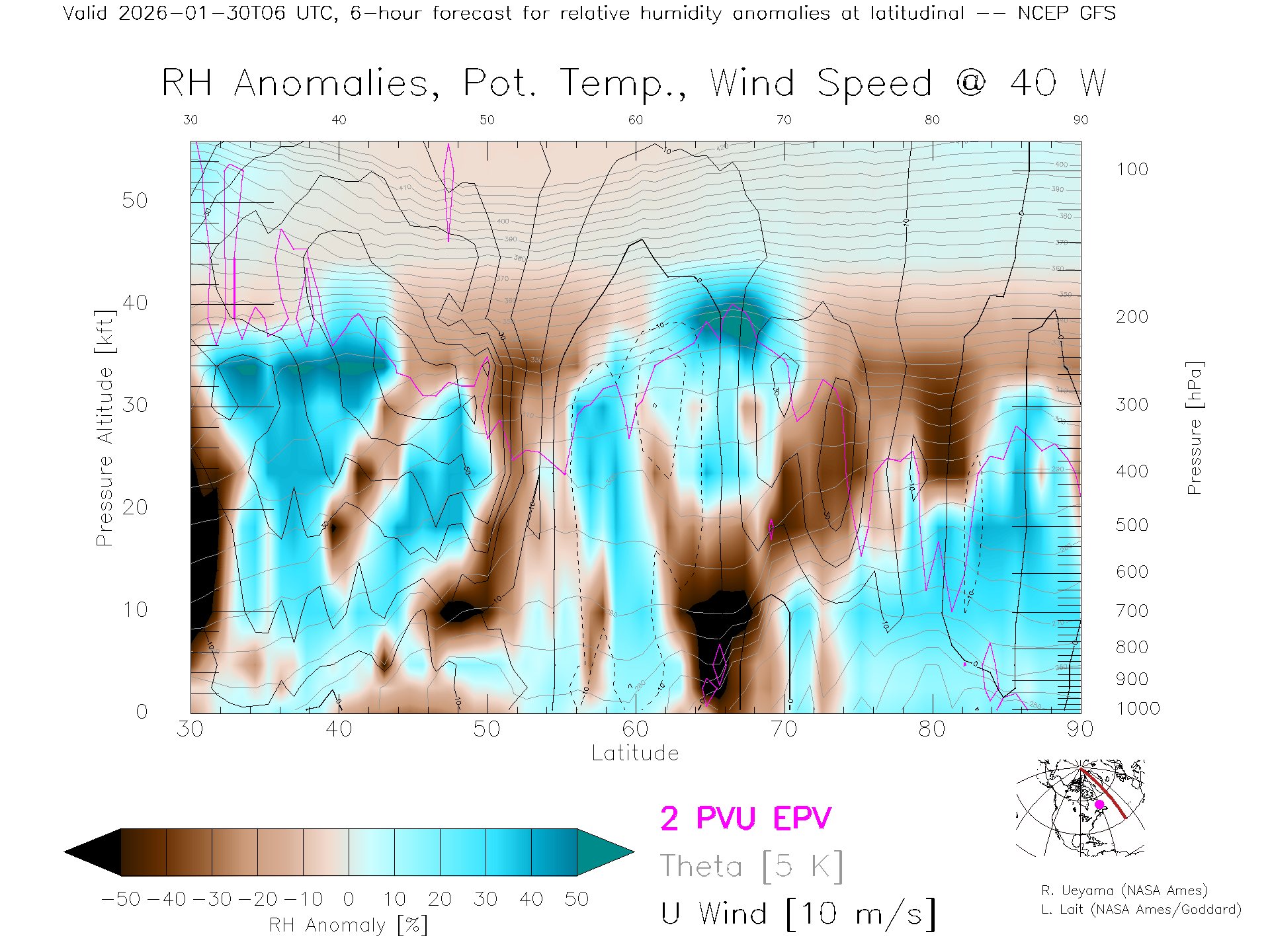 NCEP GFS Forecast Rel. Hum. X-Section (40 W)