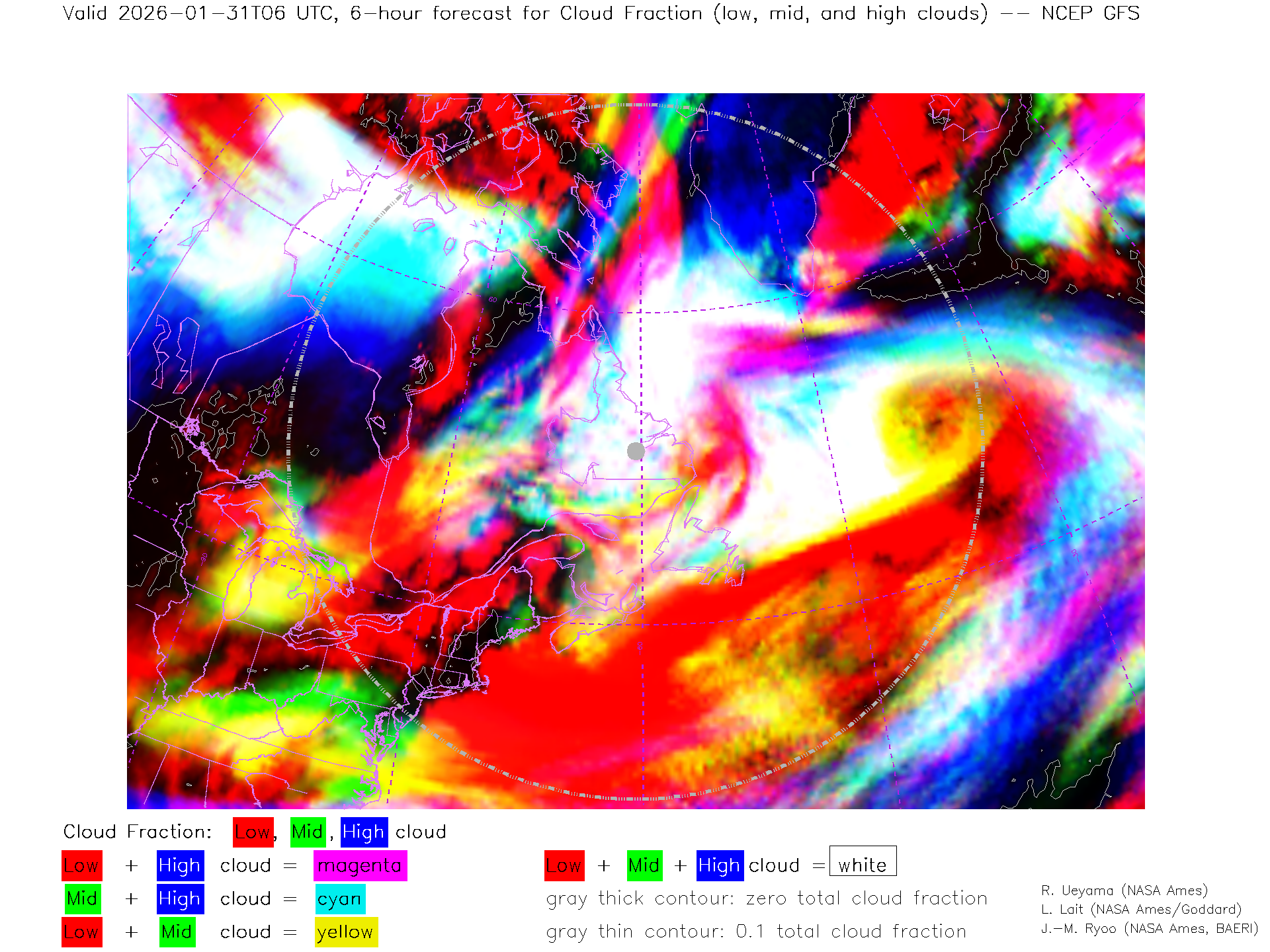 NCEP GFS Forecast Low-, Mid- and High-level Cloud Fraction