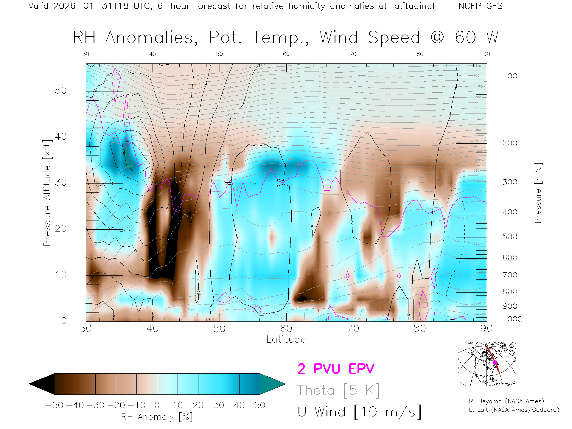 NCEP GFS Forecast Rel. Hum. X-Section (60 W)