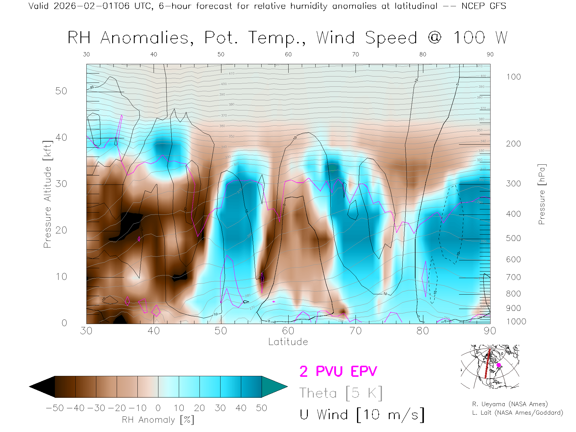 NCEP GFS Forecast Rel. Hum. X-Section (100 W)