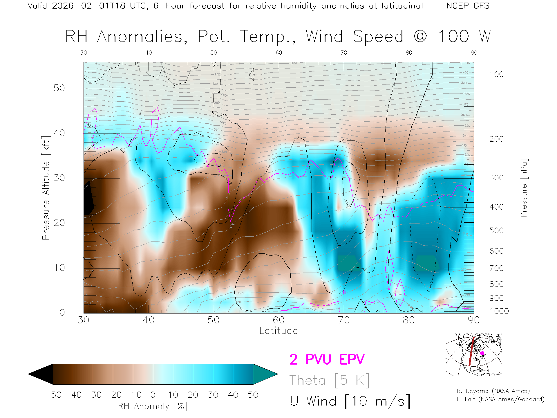 NCEP GFS Forecast Rel. Hum. X-Section (100 W)