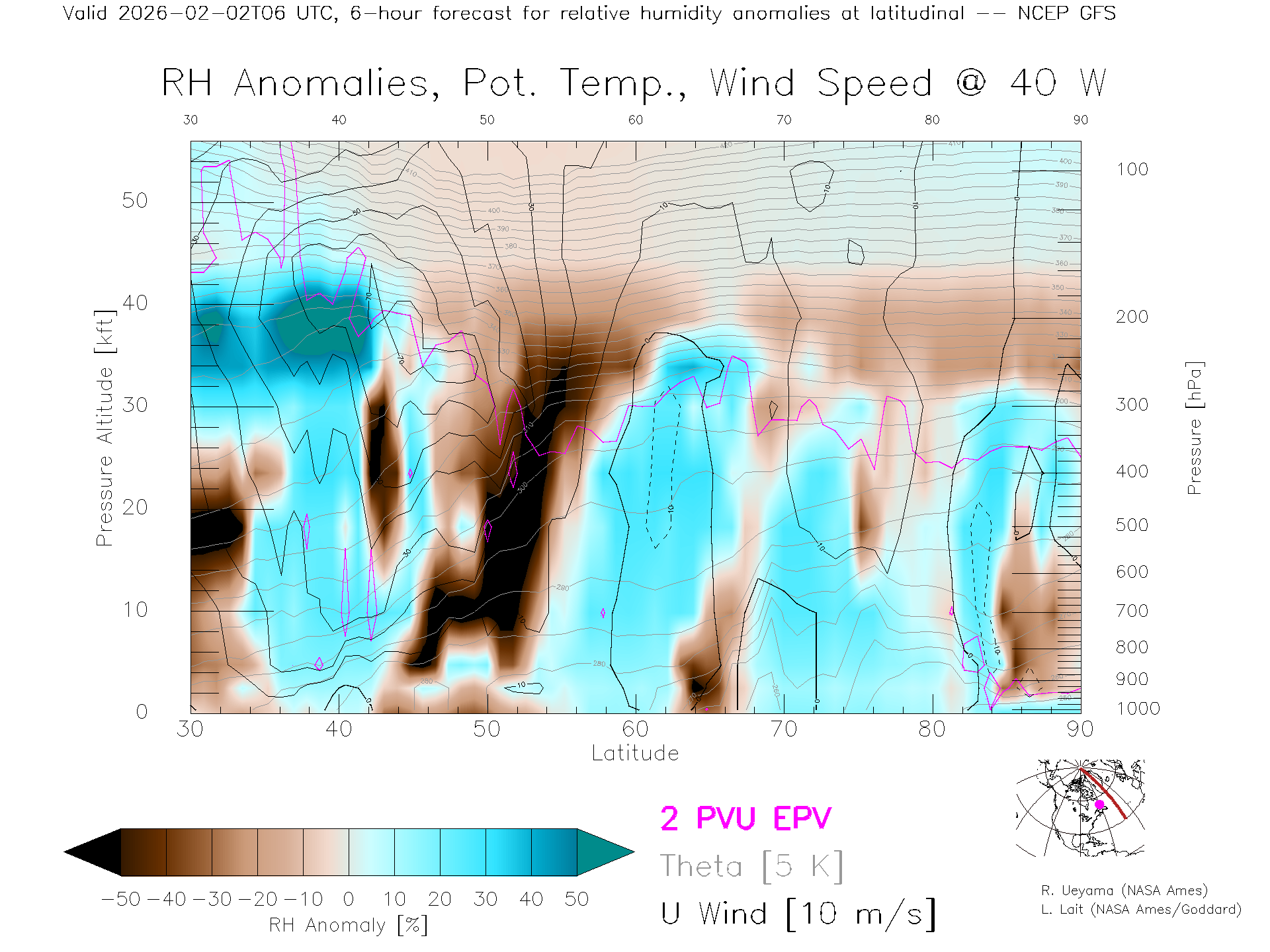 NCEP GFS Forecast Rel. Hum. X-Section (40 W)